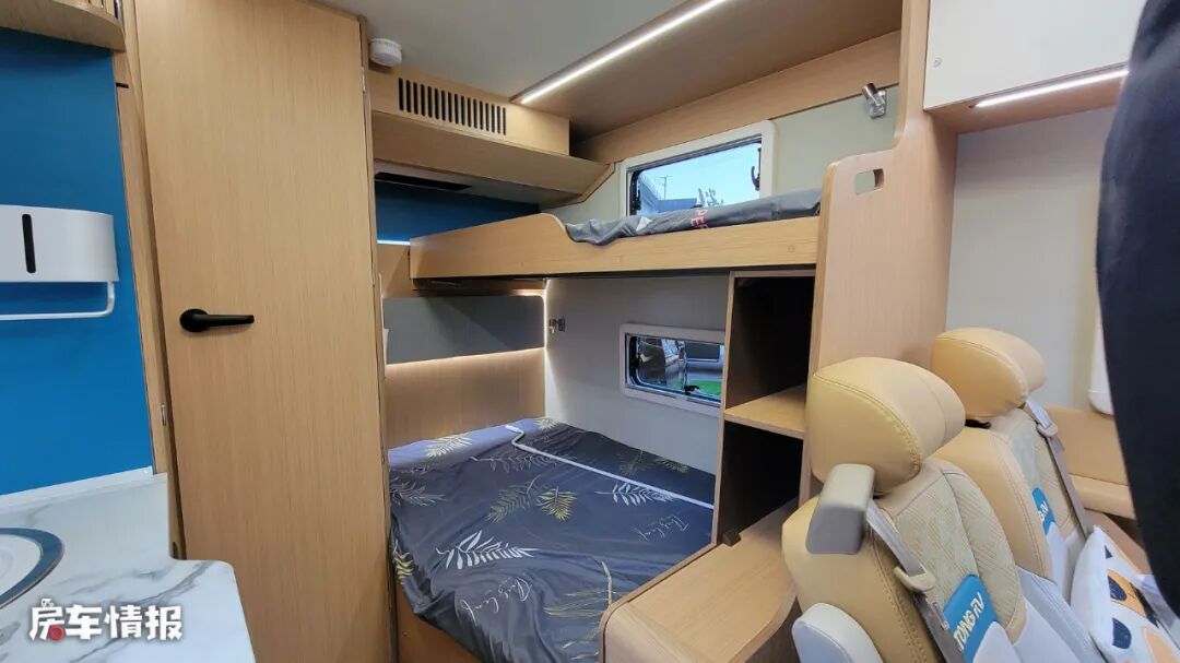 最后是全车的休息区,采用了子母床的设计,下床尺寸为1950*1150mm,上床尺寸为1950*750mm,总共可以容纳一家三口使用,另外上床还可以翻折起来,为下床提供更多的空间。