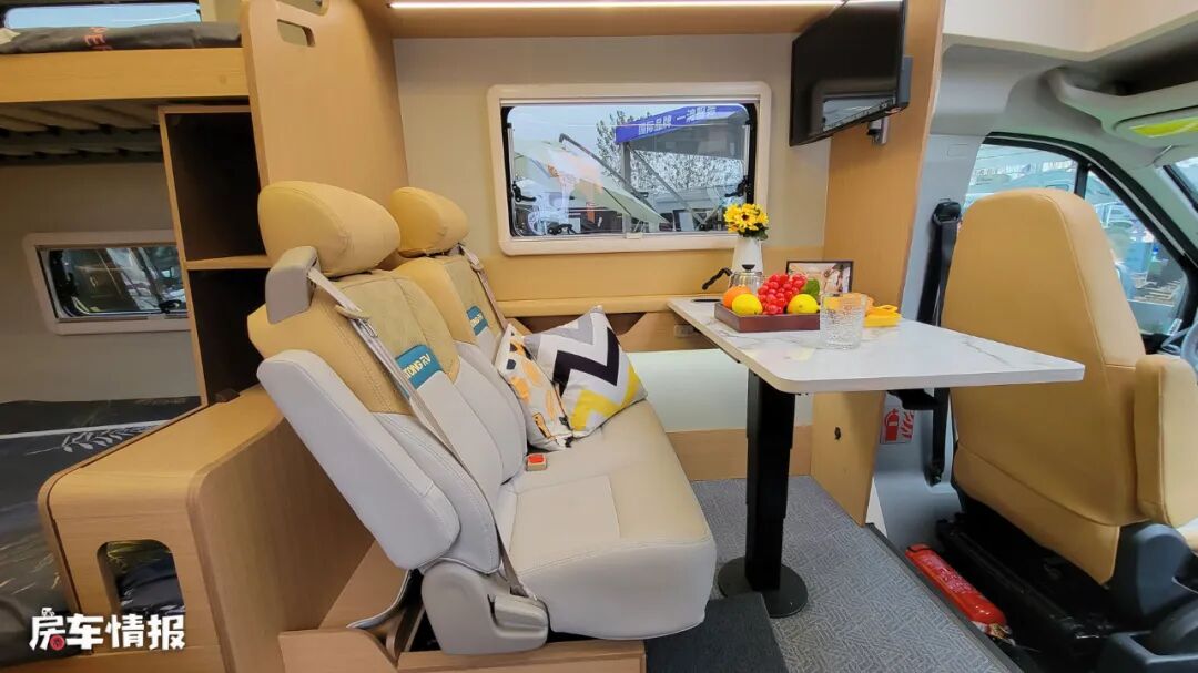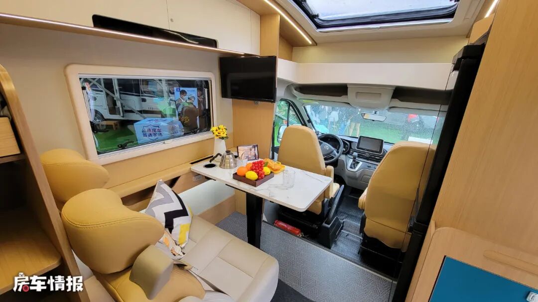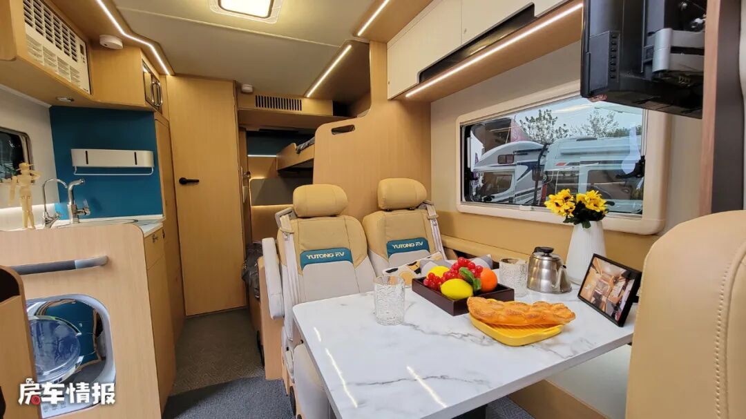 全车的会客区采用了B型房车中常见的双人沙发座椅+升降餐桌的布局,座椅使用乘客车级别的座椅,不仅可前后滑移,靠背也可以随心调节,从而达到最舒适的乘坐体验。在主驾驶后方还提供了一台24寸液晶电视,平时驻车时就可以坐在会客区享受休闲娱乐时光了。