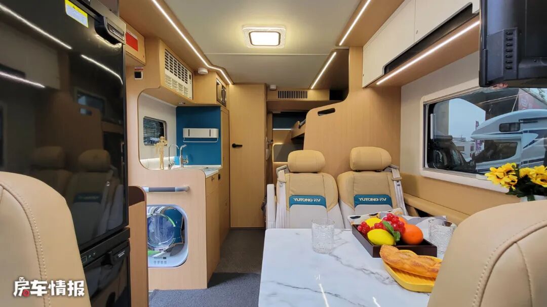 从车身右侧进入车厢内部,整体的配色都非常的温馨,米黄色的家具还带有蓝色墙板的拼接,跳色的搭配也展现了个性。