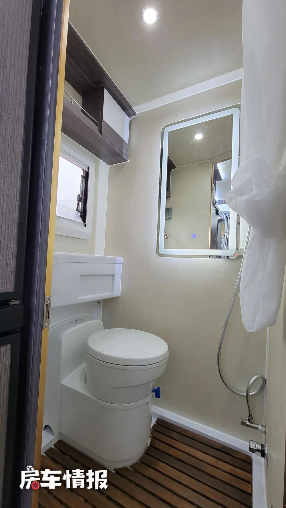纵床旁边是全车的独立卫浴室,内部提供了包括马桶、洗手台盆、淋浴花洒、带灯的梳妆镜等设施,可以满足出行的洗漱需求。