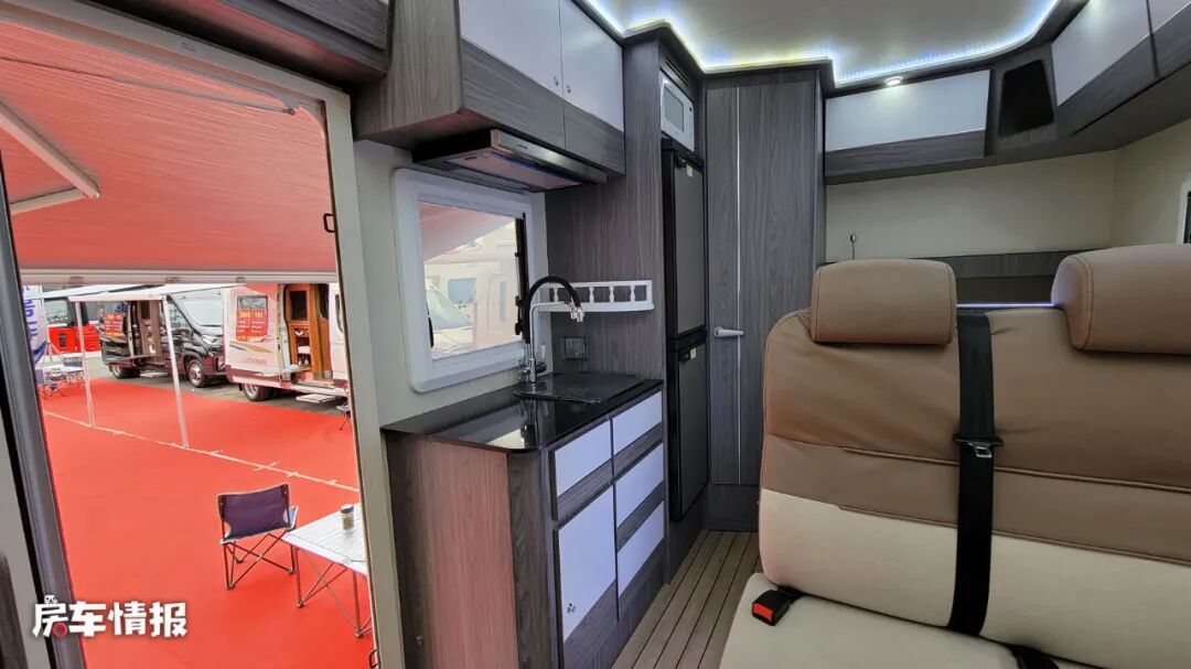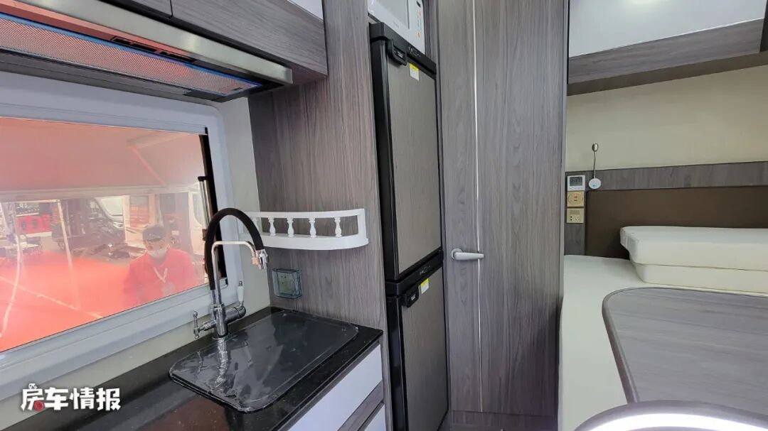 乘客门后方为全车的厨房区域,因为提供了外置的厨房,所以内部只配备了一个带盖的不锈钢洗菜池,不过因为带有220V的电源插口,后期也可以加装其他的厨用电器,满足在车内进行烹饪的一个需求。顶部还提供了一台抽油烟机,如果后期加装卡式炉或者电磁炉,也能够缓解在车内进行烹饪时所产生的油烟影响。