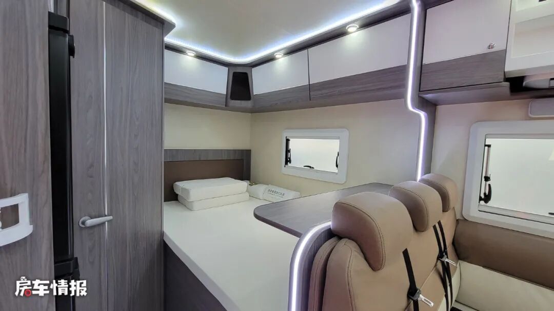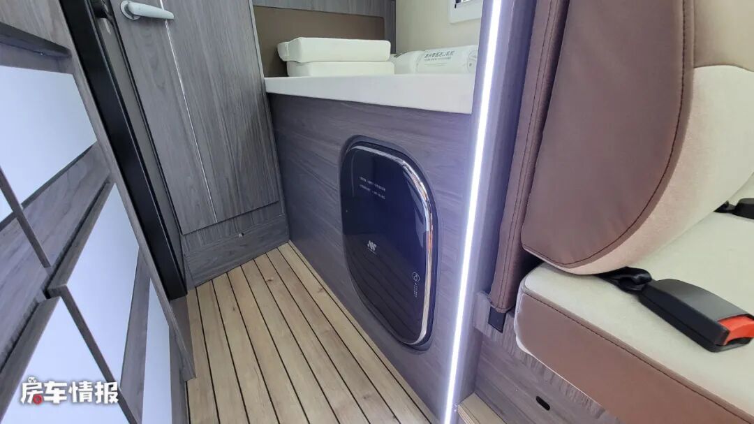 车厢尾部的休息区采用了纵置双人床的设计,床尾处还设计了一个小型的工作台面,晚上打打游戏看看剧都是不错的选择,另外上方还配置了一圈L型的储物吊柜,存放一些贴身的衣物也是不错的选择。同时在尾床的侧面还嵌入了一台mini的洗衣机。