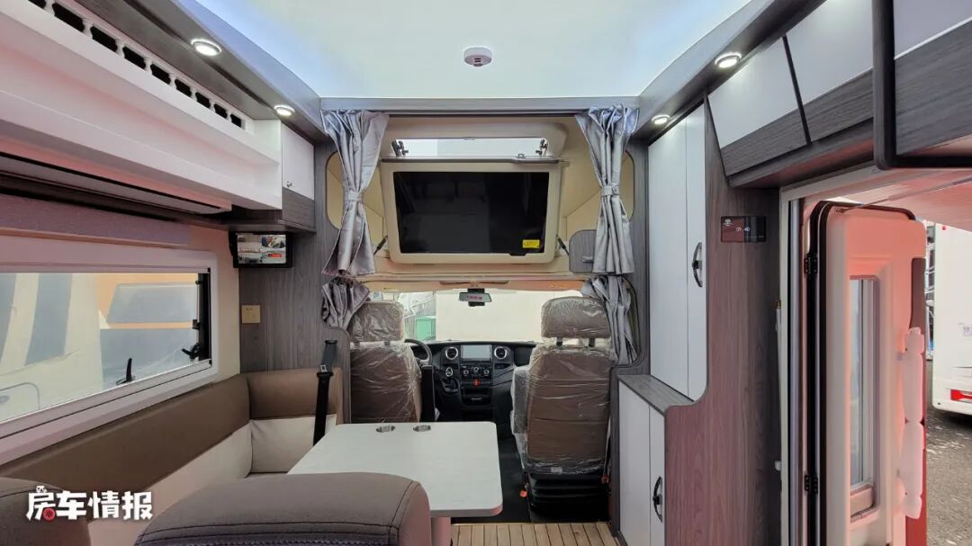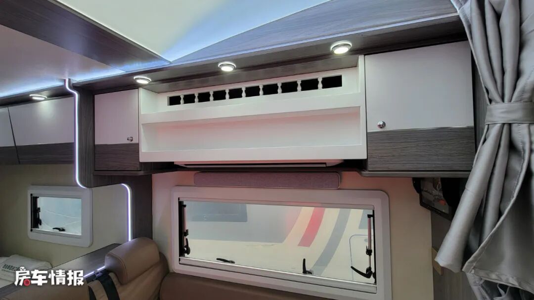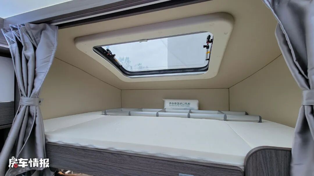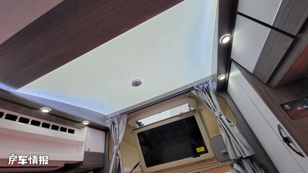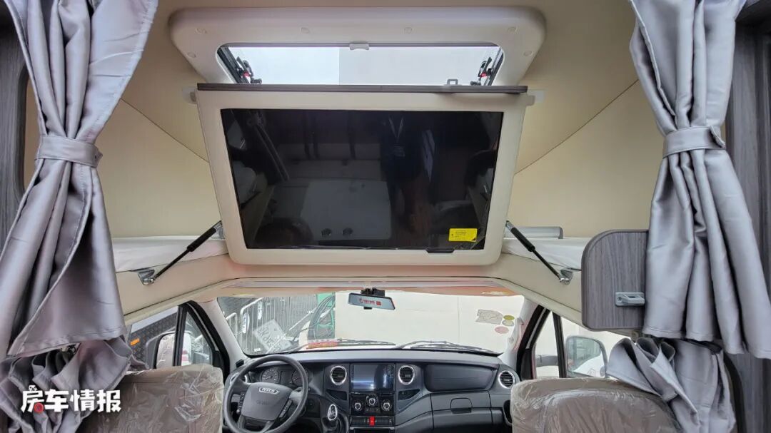 而驾驶室上方的额头区域内,依旧是标配了一张双人额头床,顶部带有大尺寸的天窗,可以保证此区域的通风以及采光,翻起床板还可以看到下方隐藏着一台40寸的液晶电视,也能满足平日的娱乐所需。