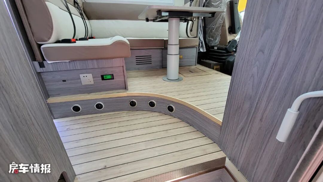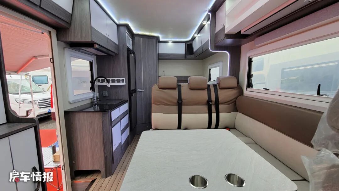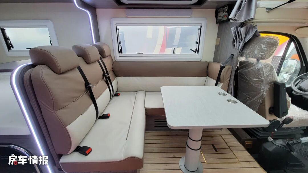 前方的会客区采用了当下最受欢迎且利用率更高的L型沙发座椅+升降餐桌的设计,座椅上配备了4条安全带,结合主副驾驶座椅,最多可以乘坐6个人。同时在侧面的墙壁上还提供了四路监控屏幕,可以更好的观察车辆周围的情况。