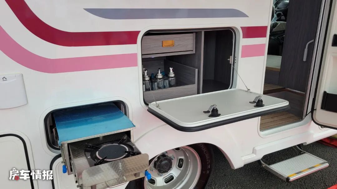 车身外部的配置相对来说还是比较完善的,包括右侧上方的手动遮阳棚,下方的外置抽拉厨房以及外置翻板,同时还带有双向抽拉式的储物抽屉,后期可以更加灵活的使用,另外在尾部还提供了大尺寸的储物舱,也可以满足一些存放行李的需求。