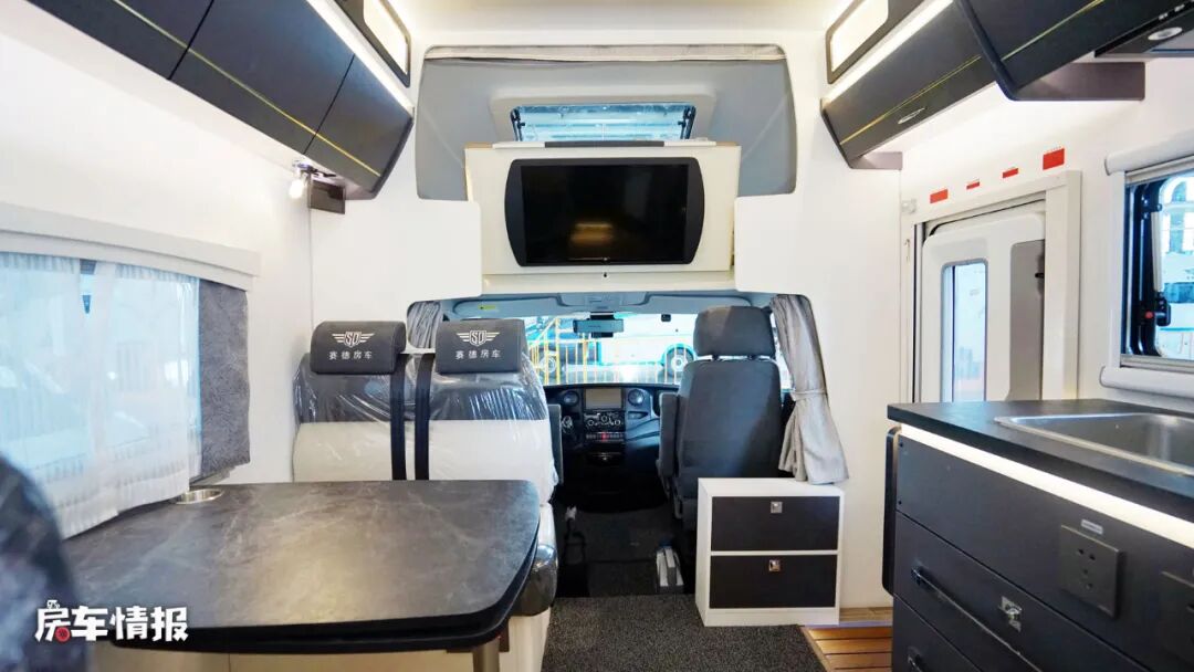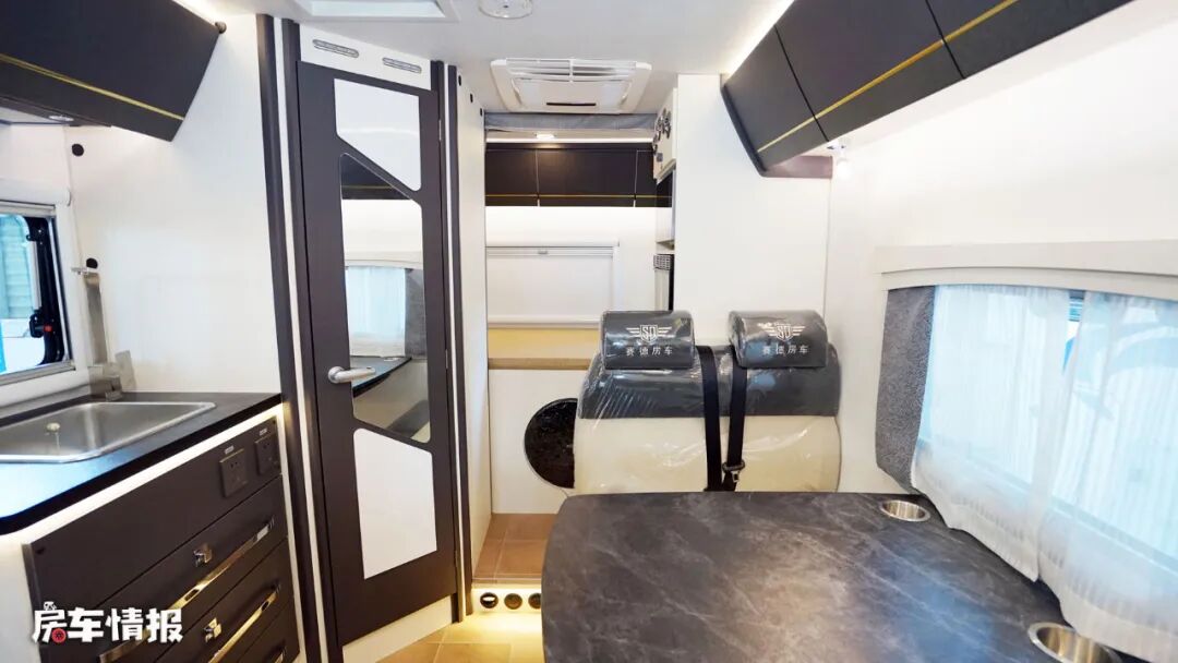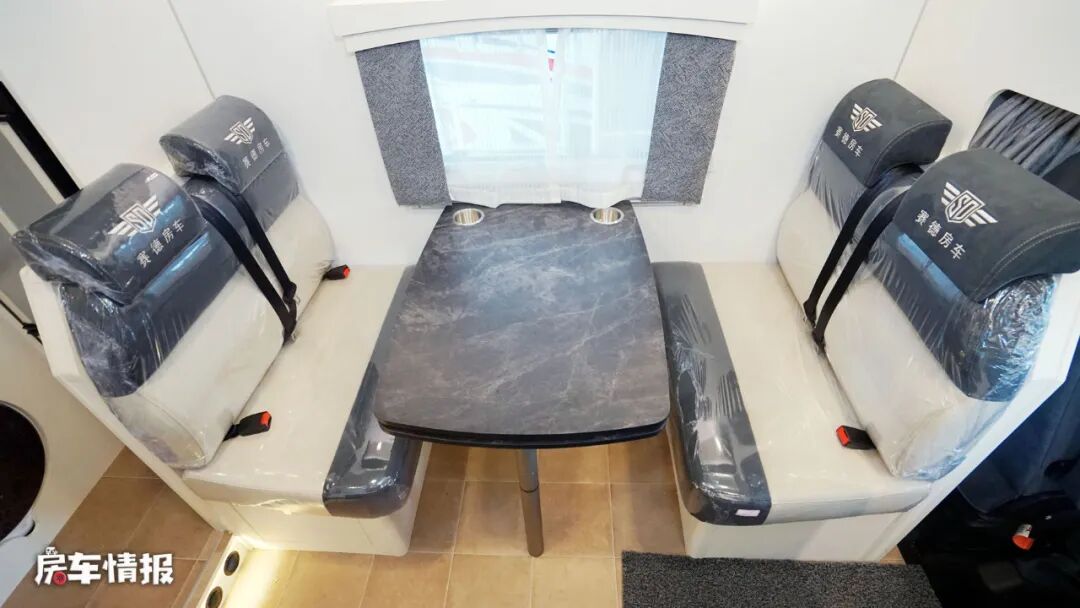 贴近车身左侧主驾驶后方的是全车的会客区,采用了经典的四人对卡座+餐桌的设计,配备4条安全带,结合主副驾驶座椅,整车最多可以核载6个人。
