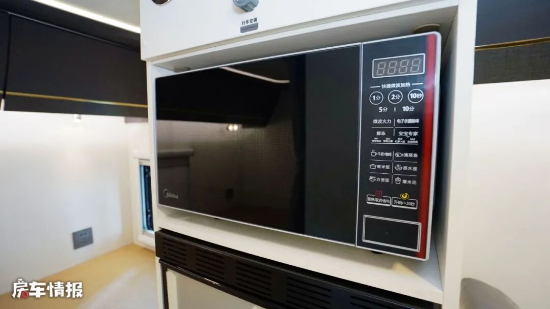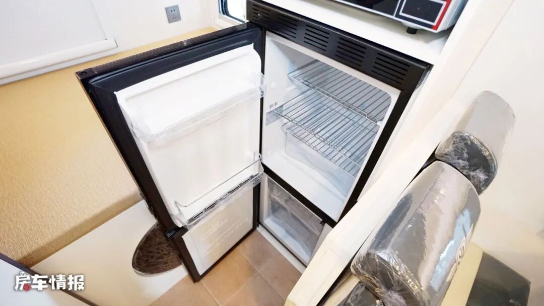 与之相对的是全车的152L上下双开门冰箱,既可以满足单独的冷冻,也可以满足单独的冷藏,使用起来更加灵活,另外上方还嵌入了一台微波炉,也可以方便日常使用。