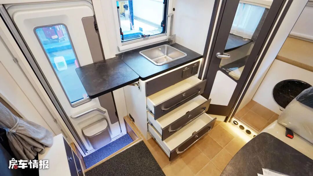 乘客门前方设计了两层的小鞋柜,上方的柜面可以作为穿鞋凳使用,既节省了空间又非常的实用,后方则是全车的厨房区,因为车身外部带有燃气灶,所以内部只提供了一个大尺寸的不锈钢洗菜盆,不过旁边也带有可拓展的折叠桌板,后期也可加装一些其他的厨用电器。台面下方则是三层储物抽屉,充足的空间足以存放各类烹饪用具。另外顶部还带有一台抽油烟机。