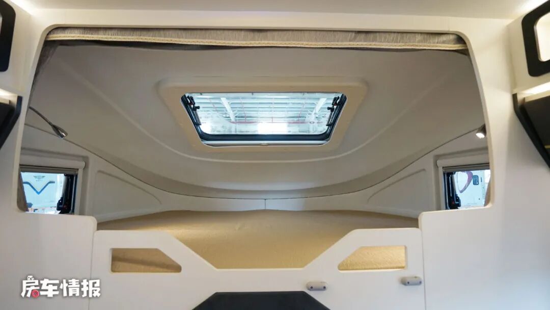 最后是车厢尾部的横置尾床,宽大的床铺完全可以满足两个成年人使用,另外在前方的驾驶室上方还标配了双人额头床,三面环窗的设计也可以增加整体的采光度,保证通风换气,在床板下方还配置了一台32寸液晶电视,满足平时的娱乐需求。