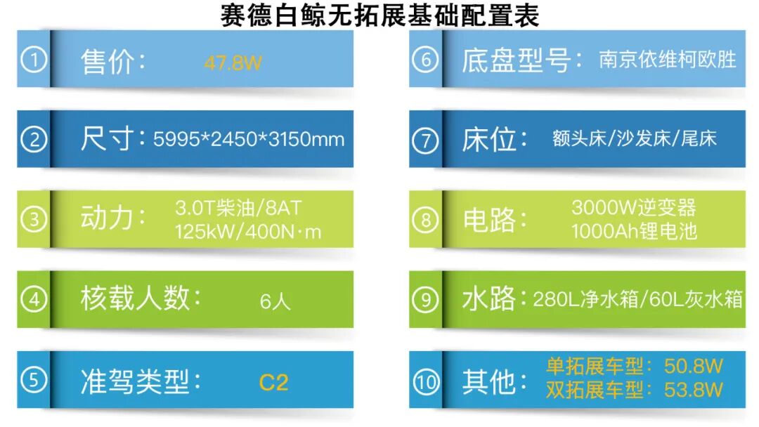 这款基于依维柯欧胜底盘所打造的赛德白鲸无拓展横床系列房车,现在的价格为47.8万元,如果后期有需要,也可以选择单拓展车型,价格为50.8万元,和双拓展车型,价格为53.8万元,不知道您更倾向于哪一种呢?欢迎在下方的评论区和我们分享您对此车的看法和感受,下期再见~