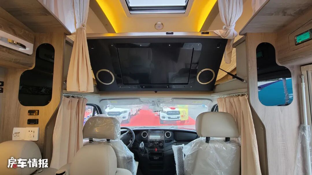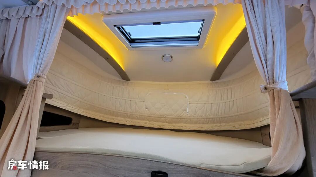 除此之外,在前方的升顶额头区域内,还配置了一张尺寸为1950*1350mm的额头双人床,也可以为两个人提供睡眠休息的地方。翻起床板,还可以看到隐藏在下方的一台32寸液晶电视,也能够满足在车内娱乐放松的需求。