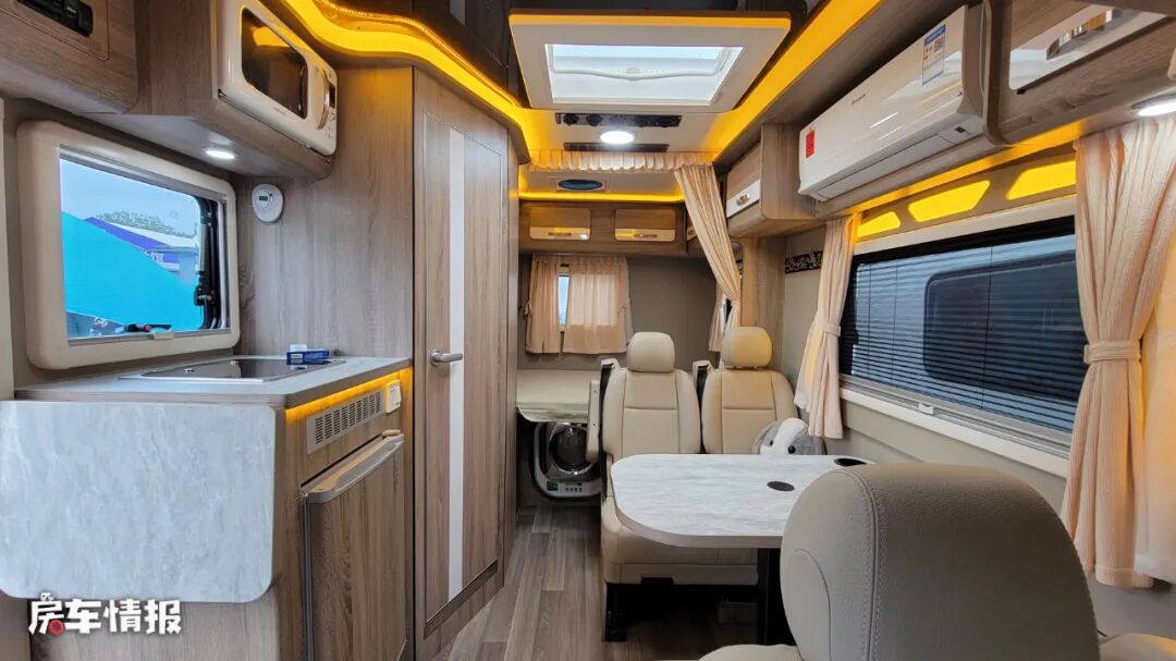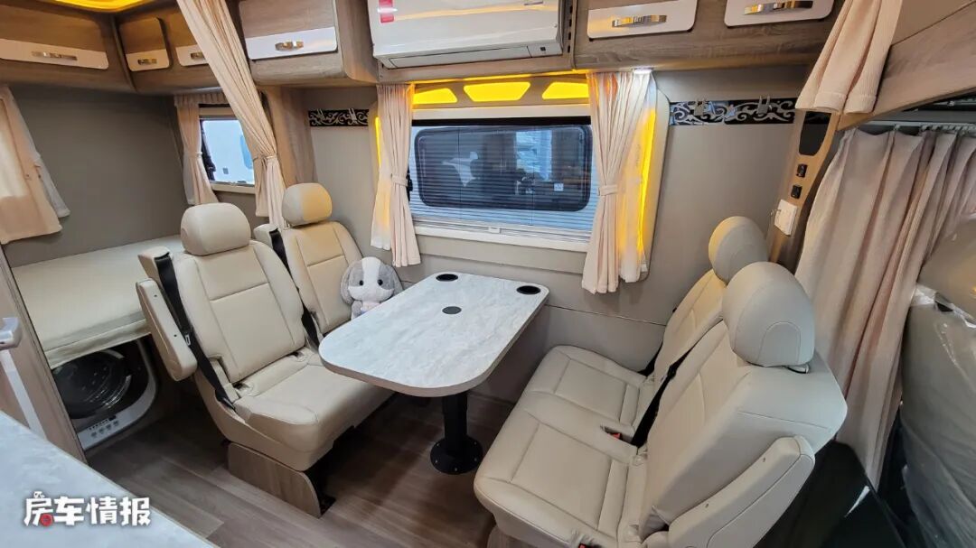 全车的乘客区和我们平时常见的更加的位置更加靠后一些,大约位于车厢中部,采用了经典的四人对卡座+升降餐桌的设计,而且所有的座椅都使用乘用车级别的设计,也可以为乘客带来良好的乘坐体验。另外会客区上方还提供了储物吊柜,中间是一台家用变频空调,可以按需调节车内的温度。