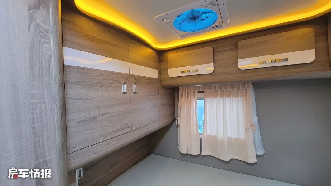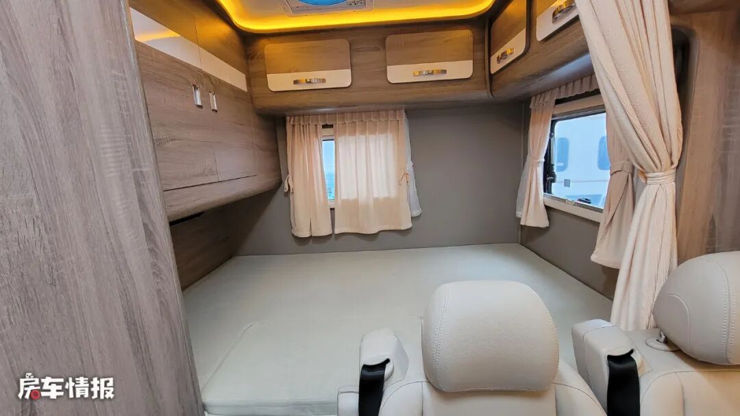 最后是位于车厢尾部的横置双人床,尺寸为1900*1200mm,可以躺下两个成年人,同时顶部一圈还配置了储物吊柜,足够存放一些换洗的衣物,也方便后期拿取。