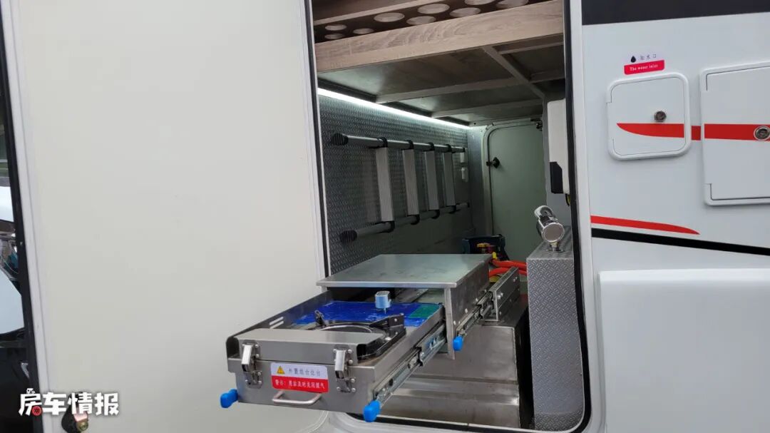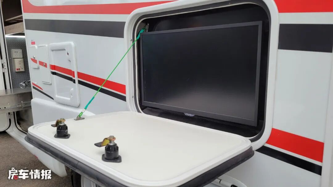 车身外部的配置也比较有意思,在乘客门的后方隐藏了一台24寸的室外电视,天气好的时候,打开遮阳棚,也可以在外面享受安逸的时光。同时在车尾部还提供了一个左右贯通式的储物舱,内部还隐藏了一个抽拉式的厨房,能够满足在车外进行烹饪的需求。