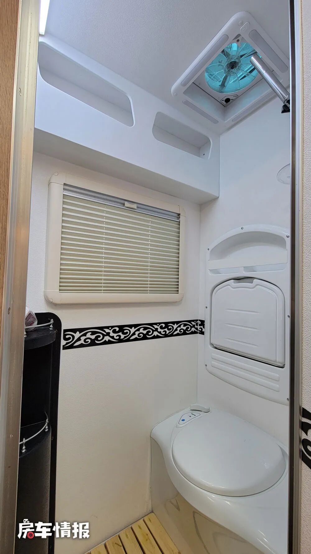 后方是全车的独立卫浴室,内部带有固定式的马桶、翻折的洗手盆、置物架和淋浴花洒等,也能够满足出行的基本洗漱需求。