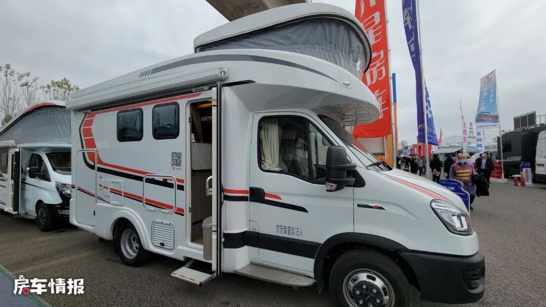 这款房车是基于国产依维柯欧胜底盘所打造的一款小顶设计的C型房车,虽然从外观上看只是很常见的小顶设计,但是妙就妙在这辆车的额头区是带有升顶的,像一只大鲨鱼的嘴一样,从前面打开。