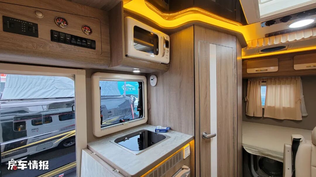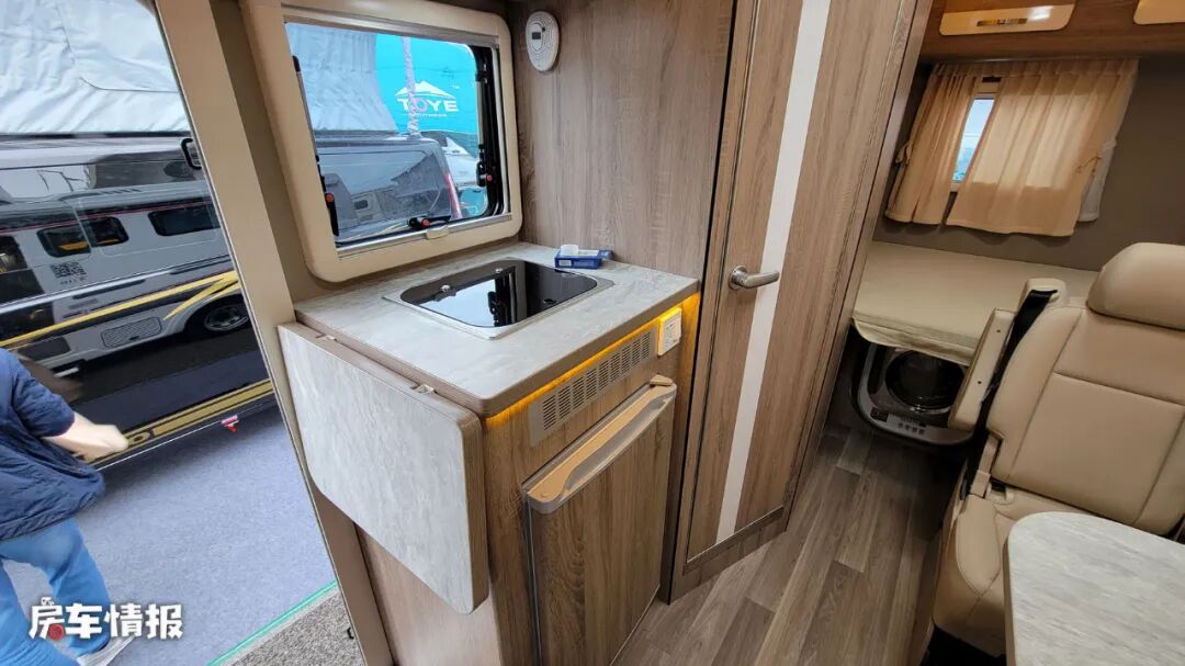 这款房车的厨房区分为两部分,一部分位于副驾驶后方,是一个带有灶台的小型橱柜,另一部分则位于乘客门后方,带有一个带盖不锈钢洗菜池,侧面则提供了拓展的翻板,也可以外接其他厨用电器使用,下方嵌入了一台65L的车载冰箱,存放一些基础的食材还是够用的。上方则提供了一台微波炉,也可以简单的热热饭菜。