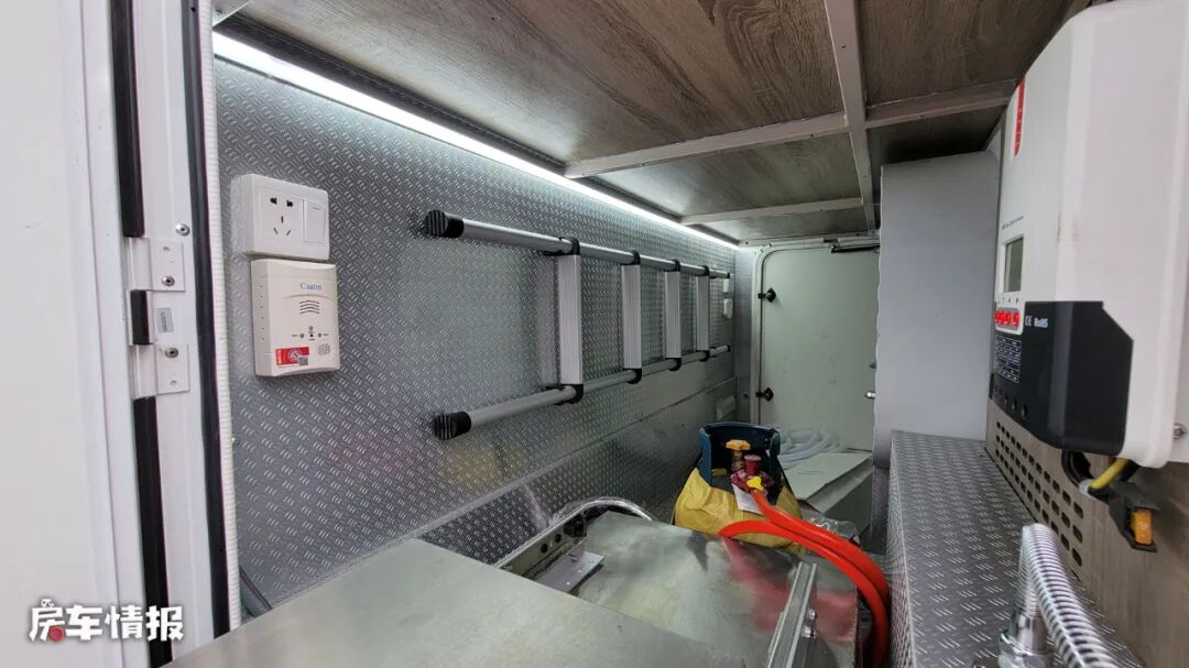 电路上,这款房车搭载了一台3000W的逆变器,提供400Ah的锂电池,同时在顶部配置了300W的太阳能电池板,后期如果有更多的用电需求也可以选装800Ah的锂电池;水路上则提供155L的净水箱、55L的热水箱和60L的污水箱,后期也可加装75L的后置净水箱,足以满足出行的用水用电需求。