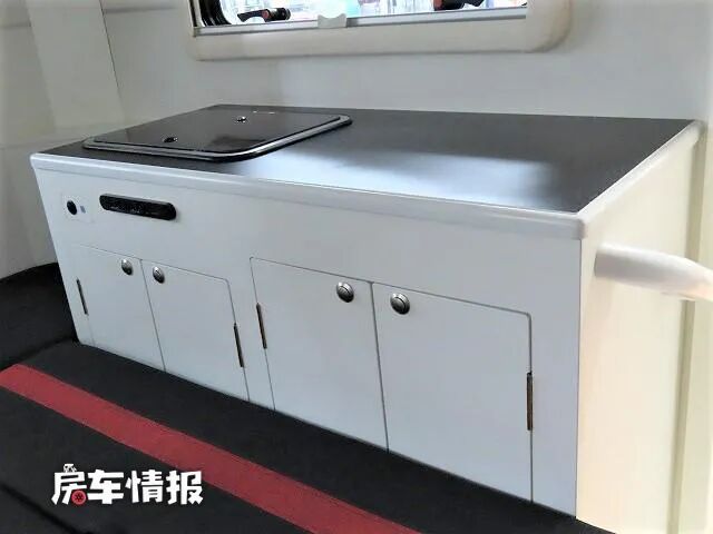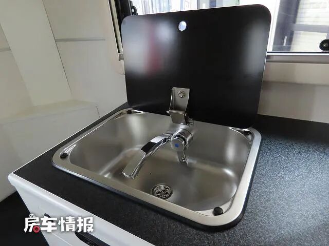 乘客门后方是全车的厨房区,整个尺寸就整体车型大小来说表现还是不错的,台面上带有翻盖的不锈钢洗菜池,旁边的空置区域可以用来备菜,也可以放置一台卡式炉,满足基本的烹饪需求。下方则是提供了一些储物柜,存放一些基本的日常用品也是可以的。