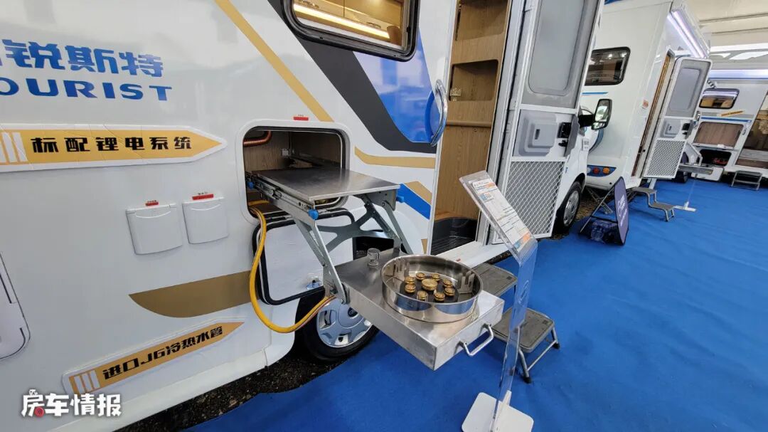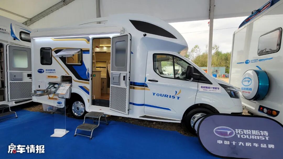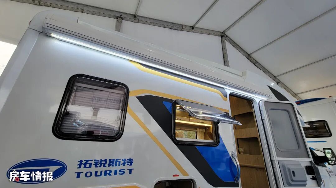 全车采用白色为主色调,搭配拓锐斯特经典的蓝色和金色线条,很有品牌辨识度,同时在车身外部也配置了比较丰富的生活配置,包括右侧上方带有LED灯的遮阳棚、下方的抽拉式外置厨房区以及车身左侧的储物舱,满足日常的需求。