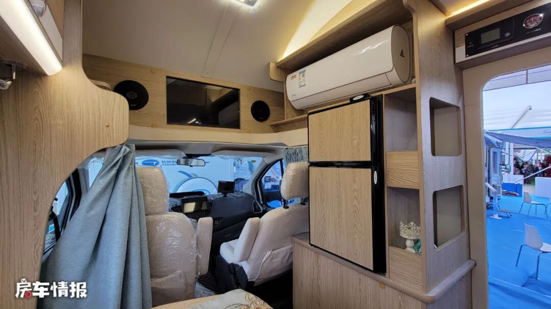 副驾驶后方则是嵌入了一台家用变频空调,下方是一台85L的上下双开门冰箱,可以分类存储食物,同时在前方的额头区域内还配置了一台24寸的液晶电视,也能够提供基础的娱乐服务。