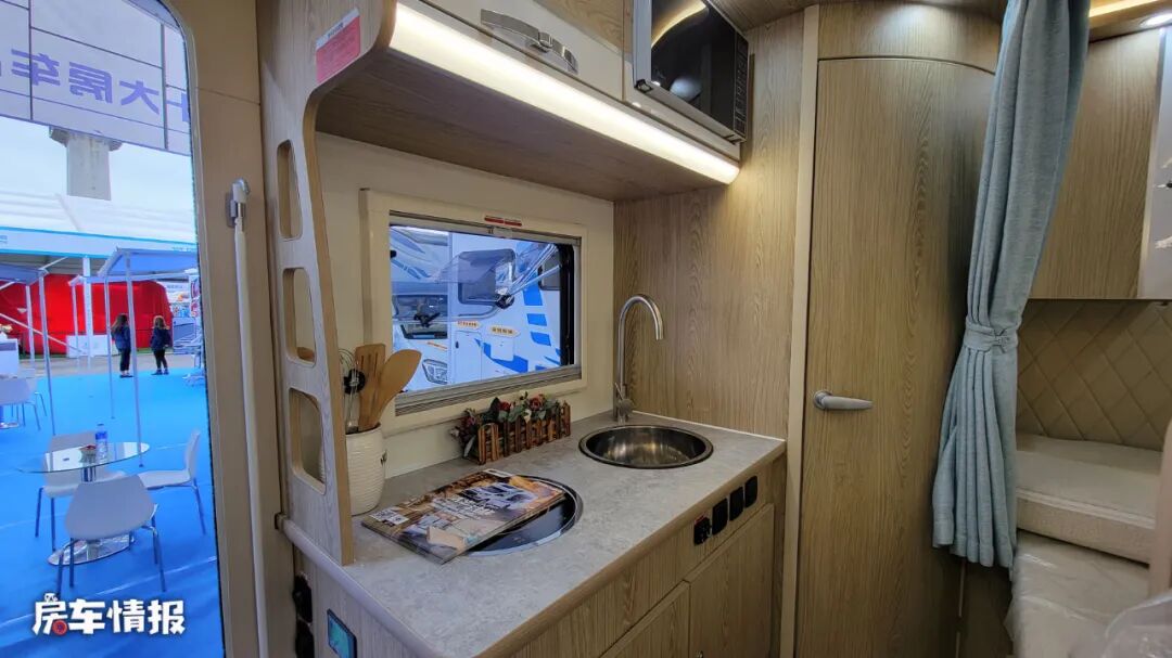 电路上,这款房车搭载另一台3000W的逆变器,提供200Ah备用电池,同时在顶部还配置了两块太阳能电池板;水路上则提供了120L的净水箱和60L的灰水箱,也可以满足出行的用水用电需求。