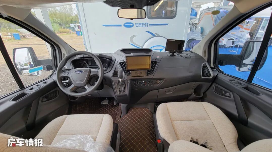 驾驶室内部也延续了原底盘的设计,满满的商务风,同时也配置了一台中控的触控大屏,可以方便驾驶员后期更便捷的操控和观察。