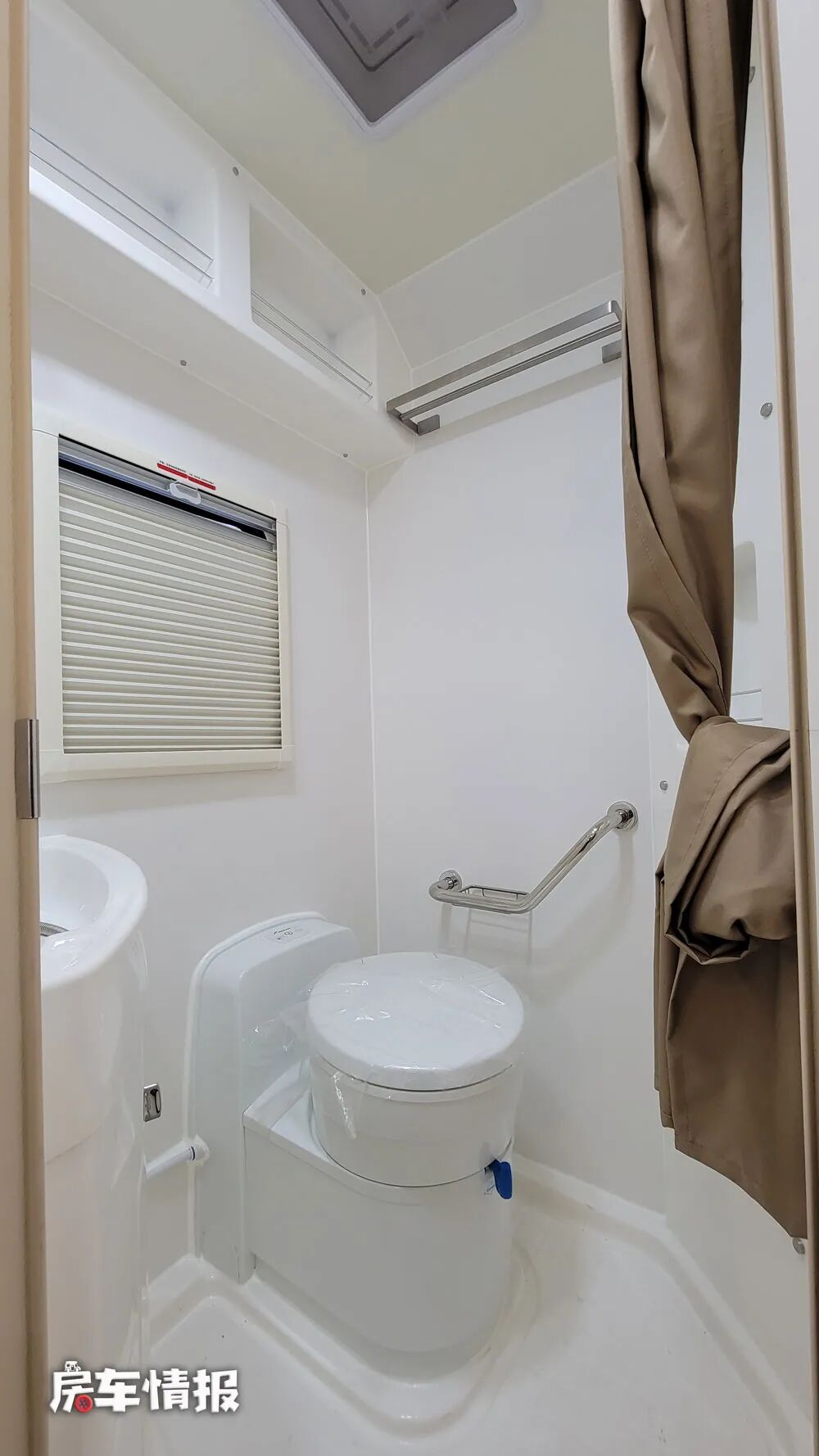 最后是位于车厢尾部的独立卫生间,内部配置了马桶、洗手台盆、置物架和淋浴花洒,另外在马桶侧面还贴心的设计了一个扶手,方便老人使用。