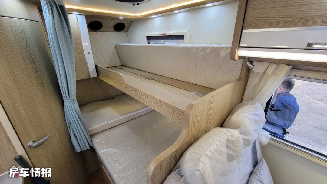 这款房车的休息区标配是一张纵置的双人床,后期也可以加装一张可翻折的尺寸为1850*700mm的上床,用来满足一家三口的使用需求,同时在上床的床头处还设计了一个小型的储物吊柜,也能存放一些贴身的物品。