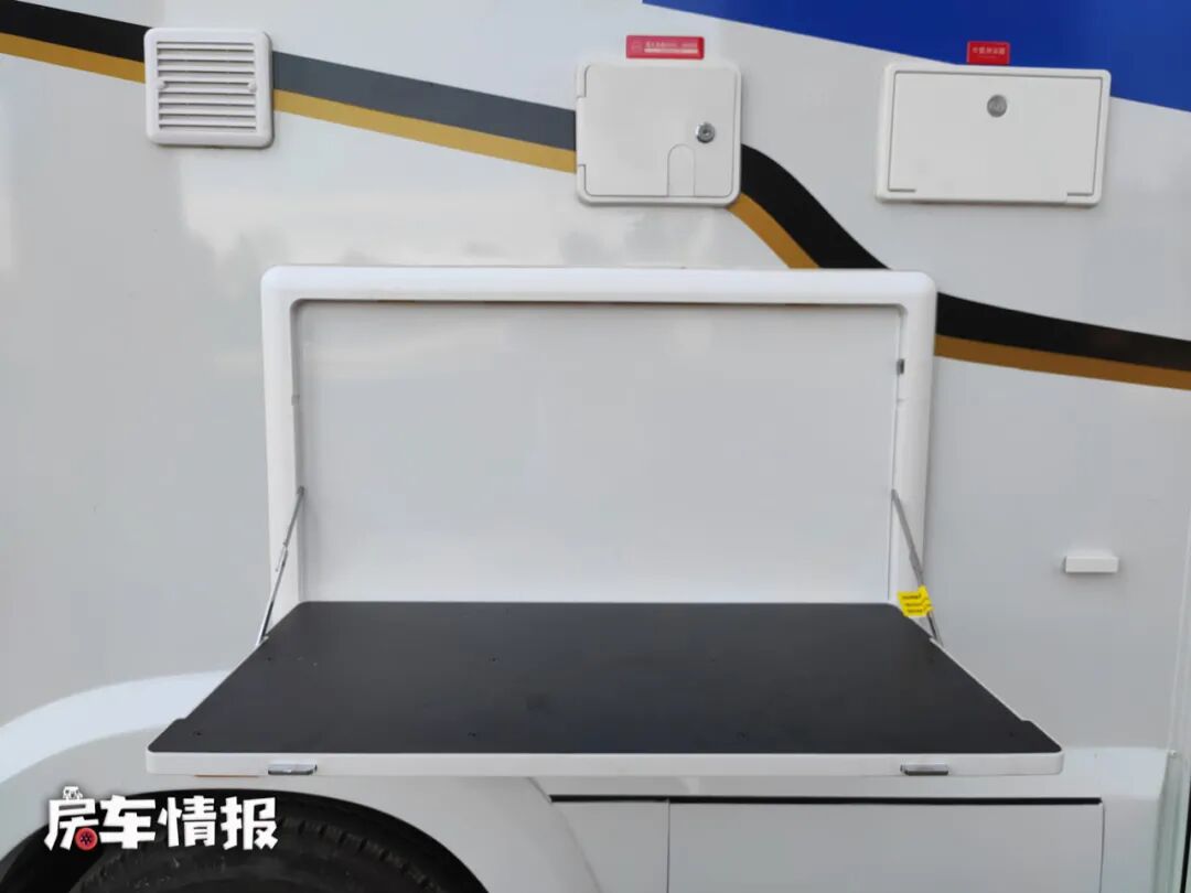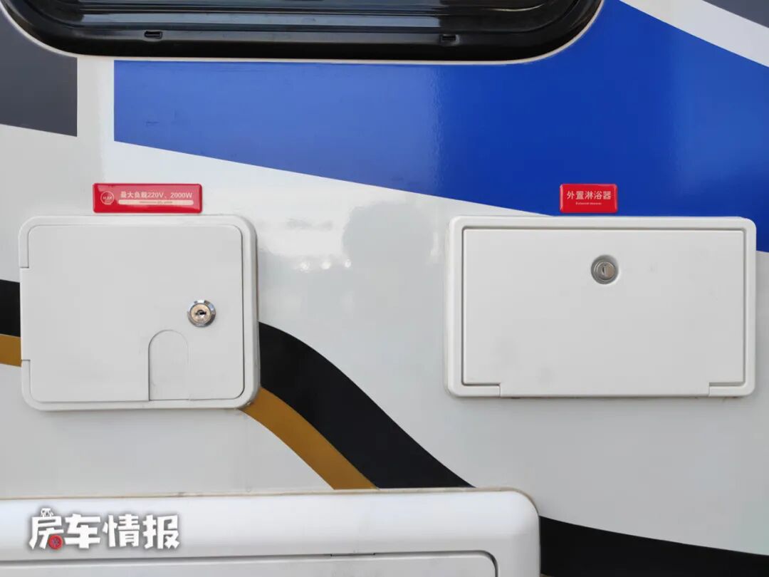 车身外部配置基本齐全,在右侧上方带有手动的遮阳棚,下方提供了外置桌板以及外置淋浴花洒,旁边还带有一个电源插口,平时负载最大功率为2000W的其他厨用电器,满足在车外进行烹饪的需求。