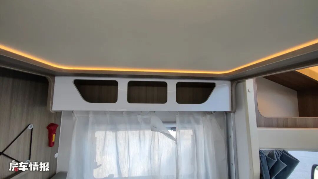 因为全车采用小顶设计,所以取消了常见的额头床,但是在前面会客区的上方还配备了一张电动升降床,尺寸为2000*1000(mm),采用一键式升降,使用起来更加方便。