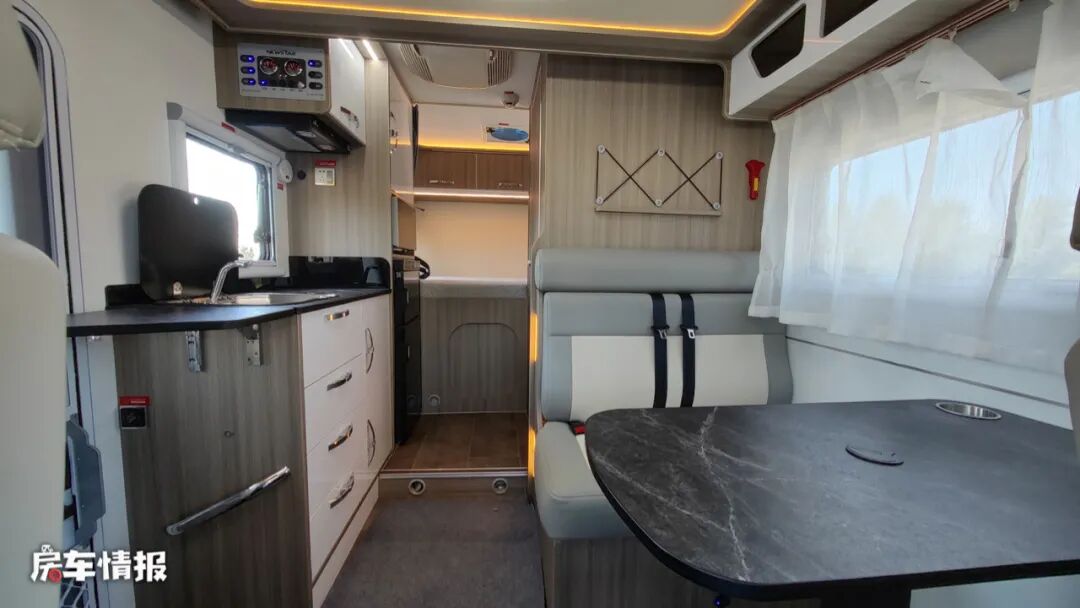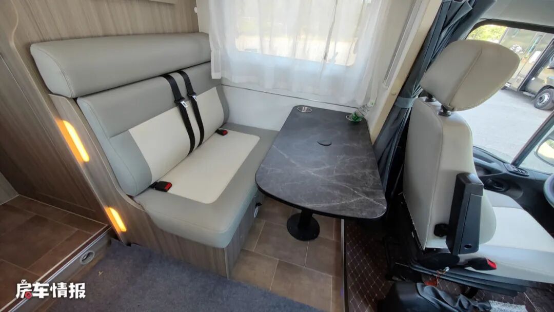 为保证车厢内部的空间最大利用率,这款房车并没有采用常见的四人对卡座或者L型沙发座椅的设计,而是使用了在B型房车中常见的双人沙发座椅+升降餐桌的布局,同时配备了两条安全带,结合主副驾驶座椅,全车最多可以荷载4人。