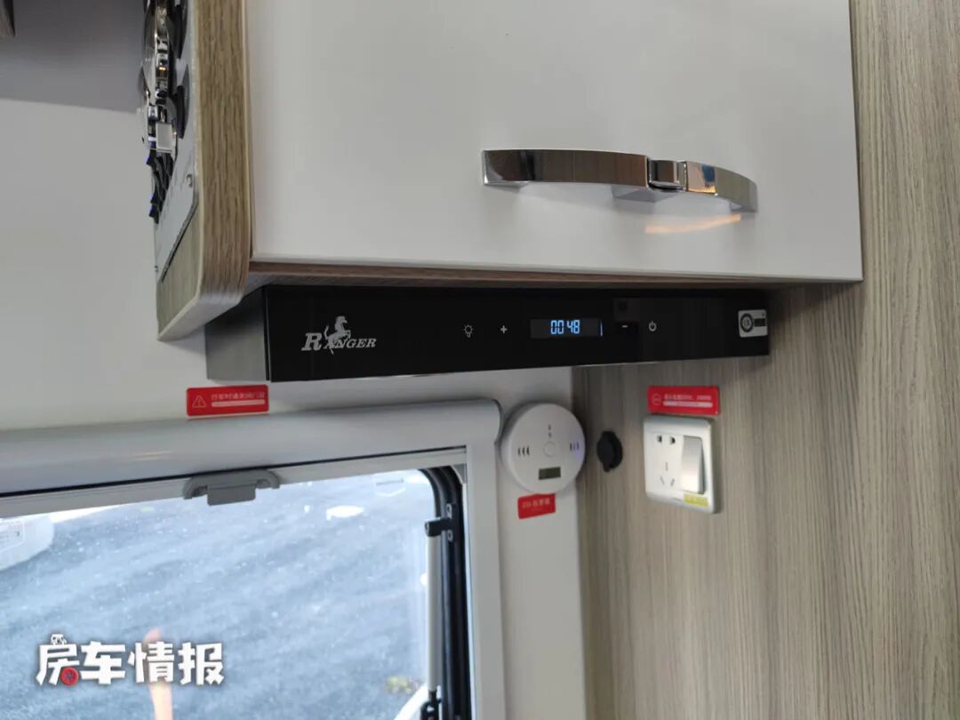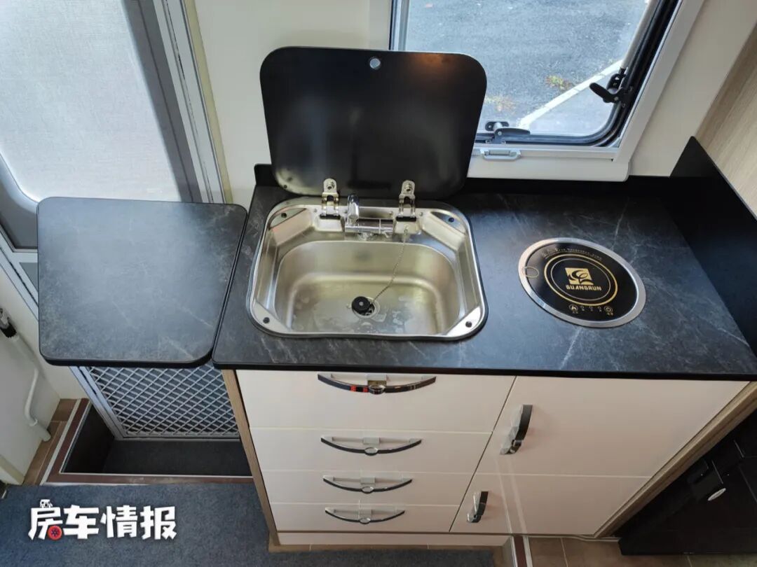 位于乘客门后方的厨房区配置基本齐全,带有大尺寸的不锈钢洗菜池,可翻折的水龙头也节省了空间,旁边是一台电磁炉,可以满足在车内进行烹饪的需求,同时在橱柜的侧面还提供了一张可以拓展的桌板,平时用来备菜还是很方便的。