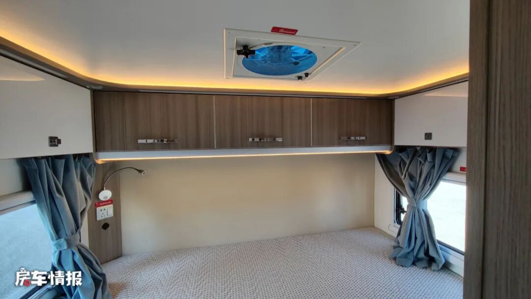 整车的休息区是采用了横置的双人尾床设计,尺寸为2100*1300mm,足够躺下两名成年人,顶部还提供了一台换气扇,侧面则是一圈U型的储物吊柜,可以存放平时换洗的衣物,同时床头床尾都带有外推窗,保证内部的采光。