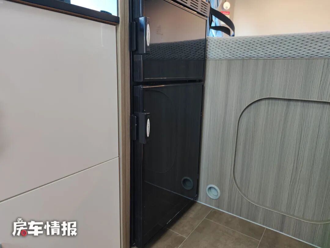 厨房区后方的区域内包含了一台微波炉以及一台118L双开门的车载冰箱,可以满足平时生活所需。