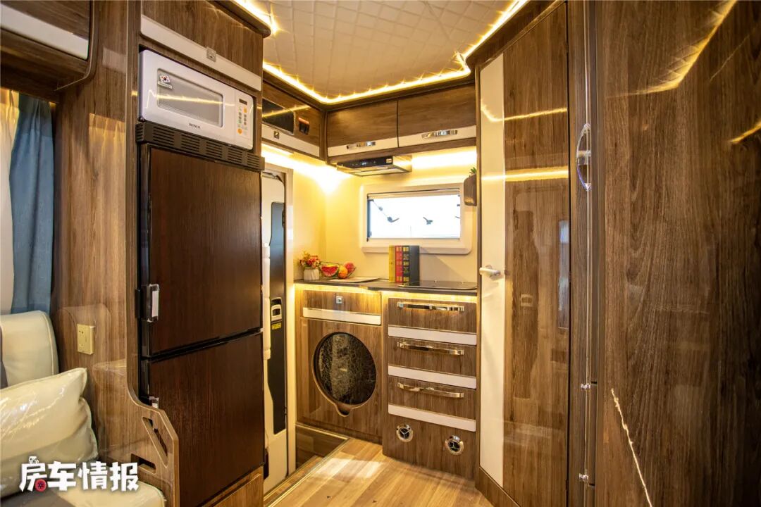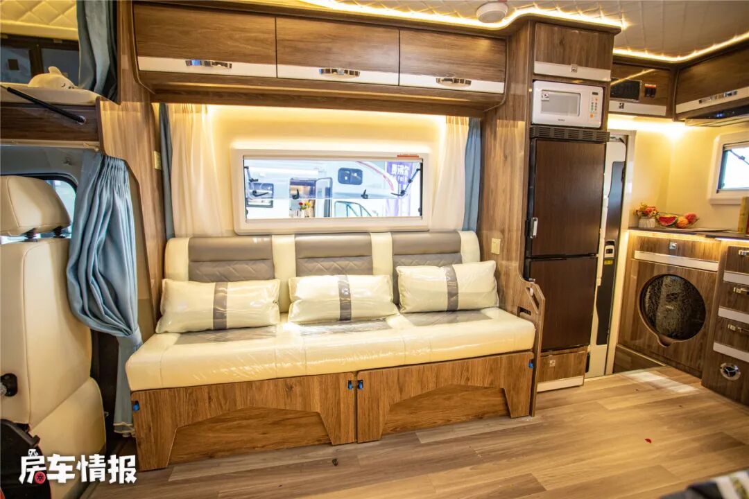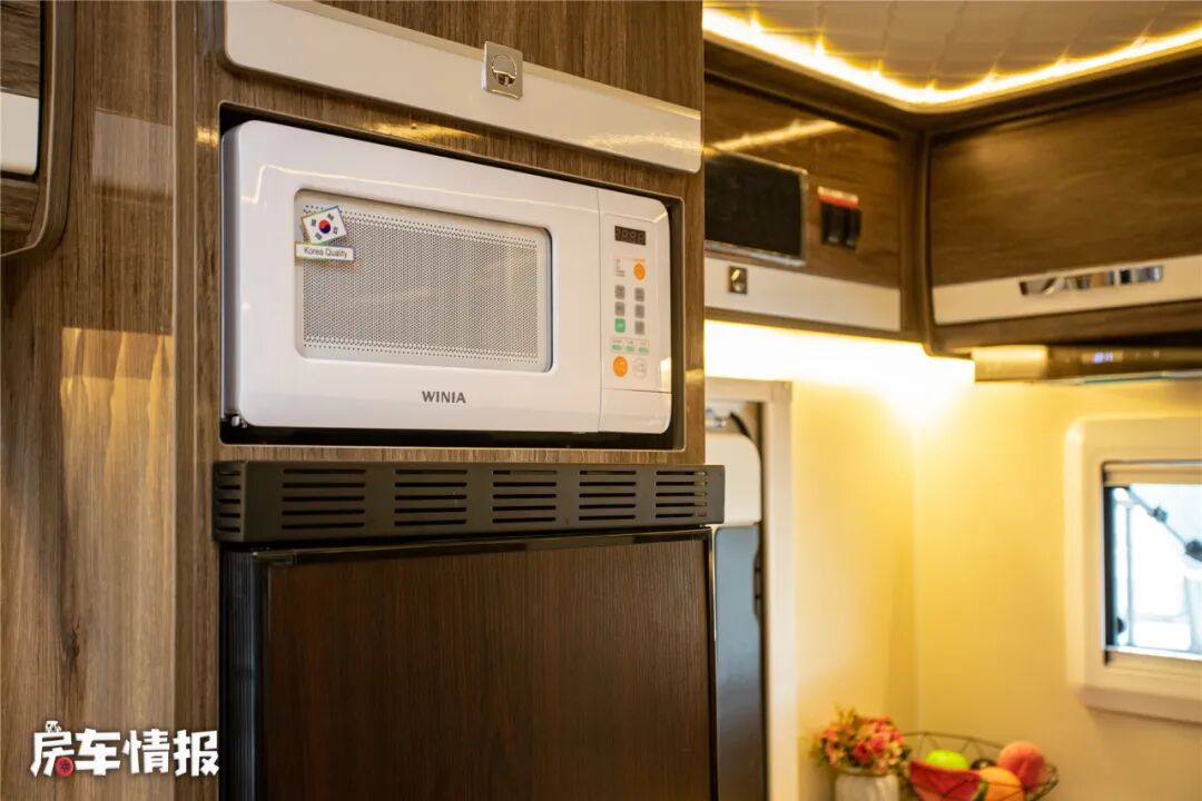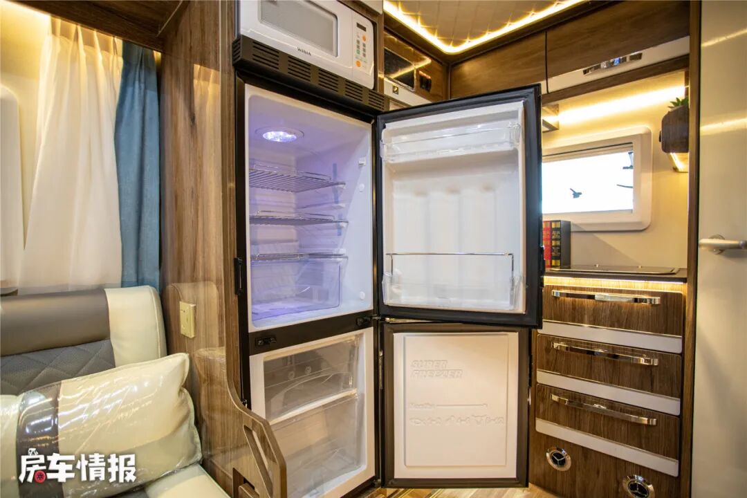 位于厨房另一侧提供了一台148L房车专用冰箱以及一台微波炉,冰箱微波炉所在的位置刚好形成一个隔断墙的作用,把车尾区域和前方三人沙发分隔开。