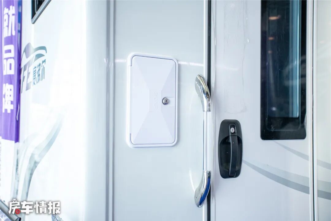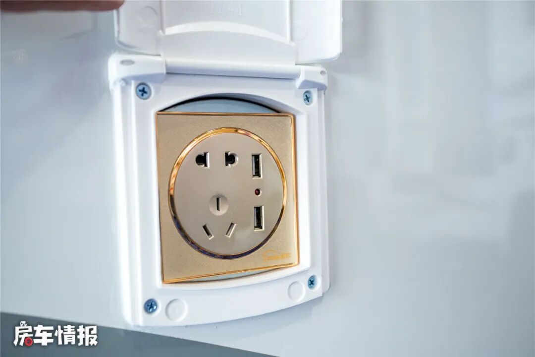 于此同时在车身外部也加入了一些常用的生活设施,手动遮阳棚、电动踏步、外接电源输出插口、外置淋浴花洒等,基本上能够满足日常实用的需求。