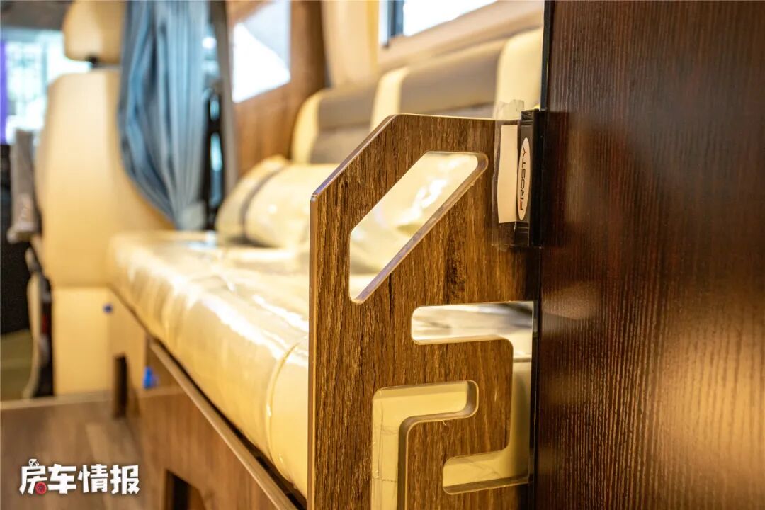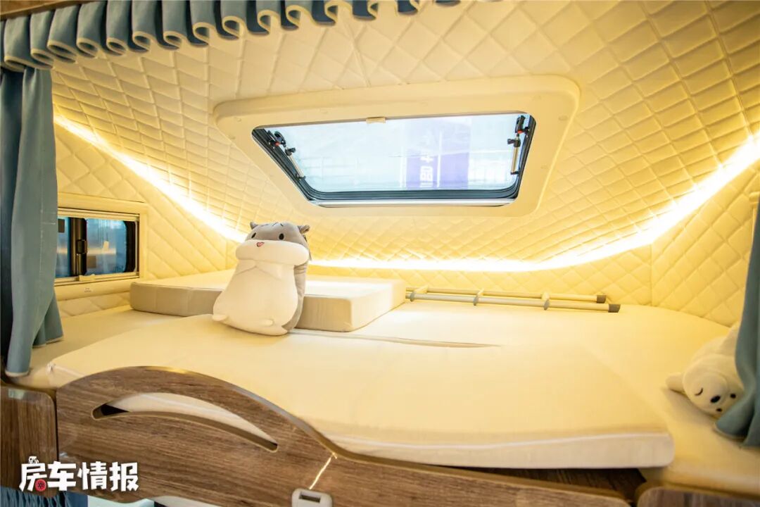 驾驶室上方依然是一张额头床,尺寸不小,垂直空间也很不错,日常使用时睡下2名成年人没有问题,加上前方2张沙发床,整车可以满足一家5口人住宿,且住的比较宽松不用担心拥挤。