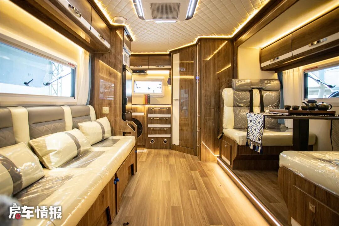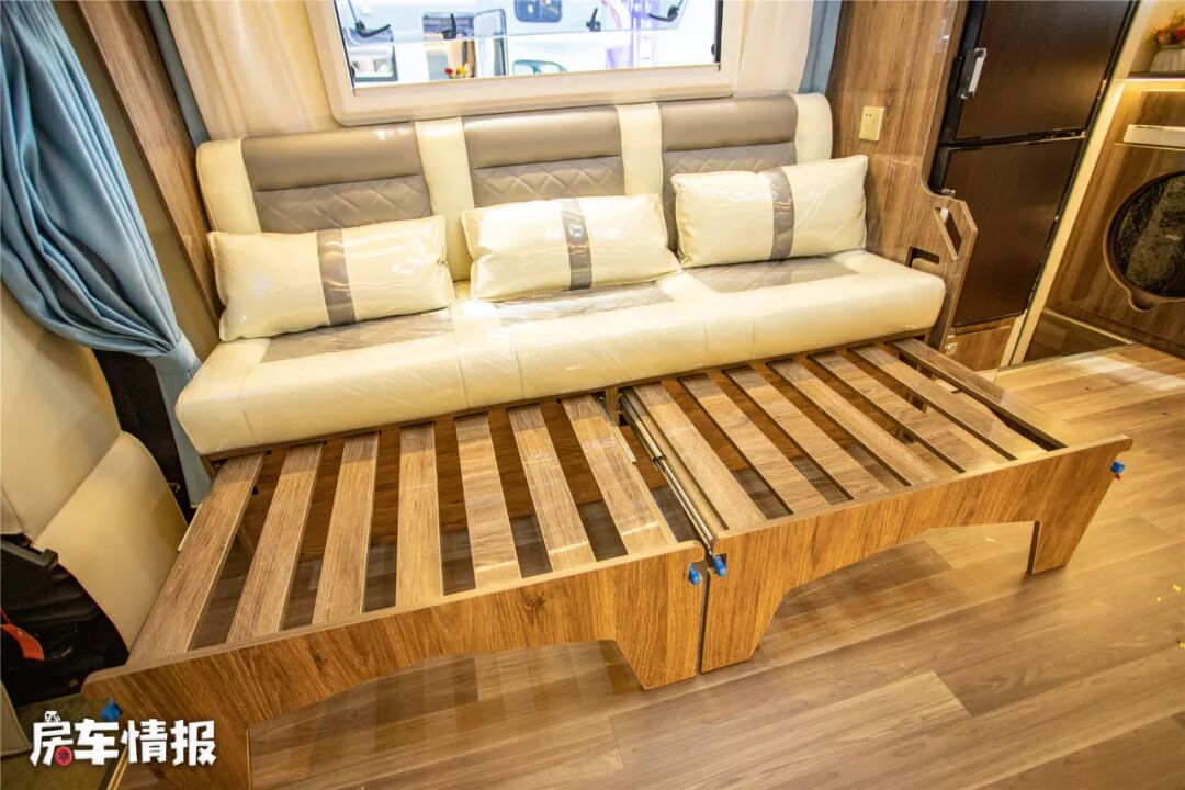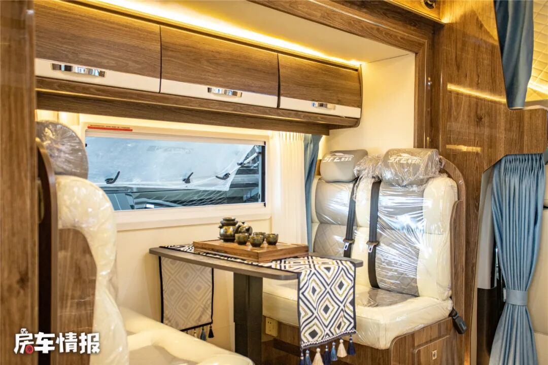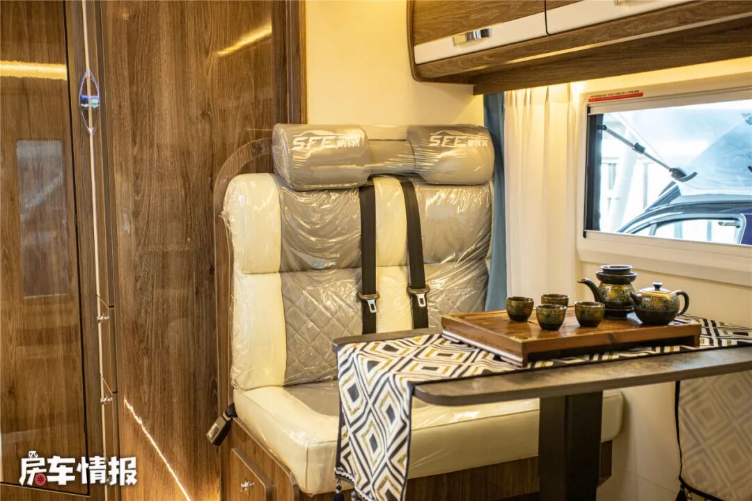 车身右侧拓展舱打开以后是一组四人卡座沙发区域,座椅上带有安全带,这也就意味着行车时可以乘坐,到了晚上休息的时候,还可以把餐桌降低,把这里拼成一张沙发床,尺寸不是很大,可以作为儿童床使用。