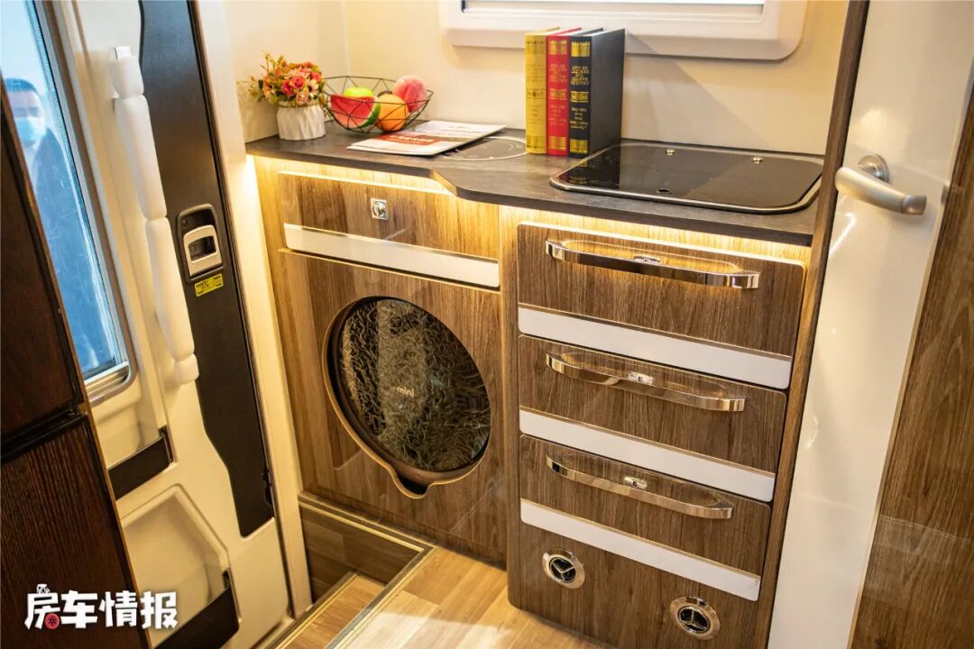 位于厨房下方还提供了一台带有烘干功能的洗衣机,在旅行中也可以轻松便捷地清洗随身衣物。