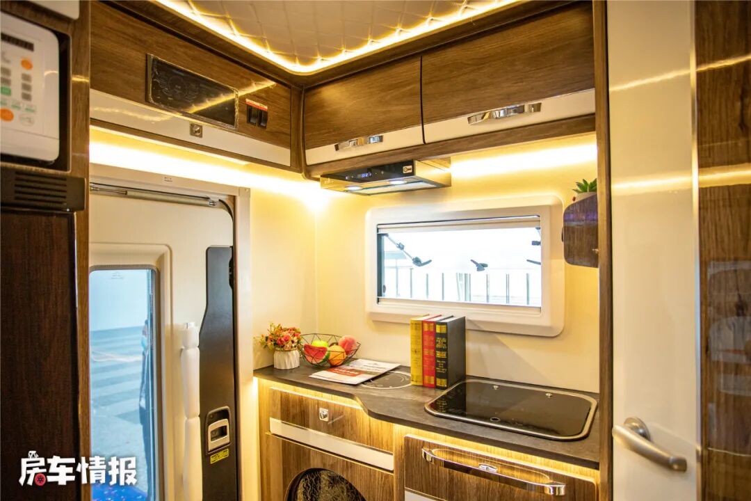 来到车厢后方,也就是车厢门处,这里是车内的厨卫区域,位于最后方的厨房提供了电磁炉、抽油烟机、洗菜池等基础设施,应对日常使用没有问题,也不用担心油烟或油渍把车内弄脏。