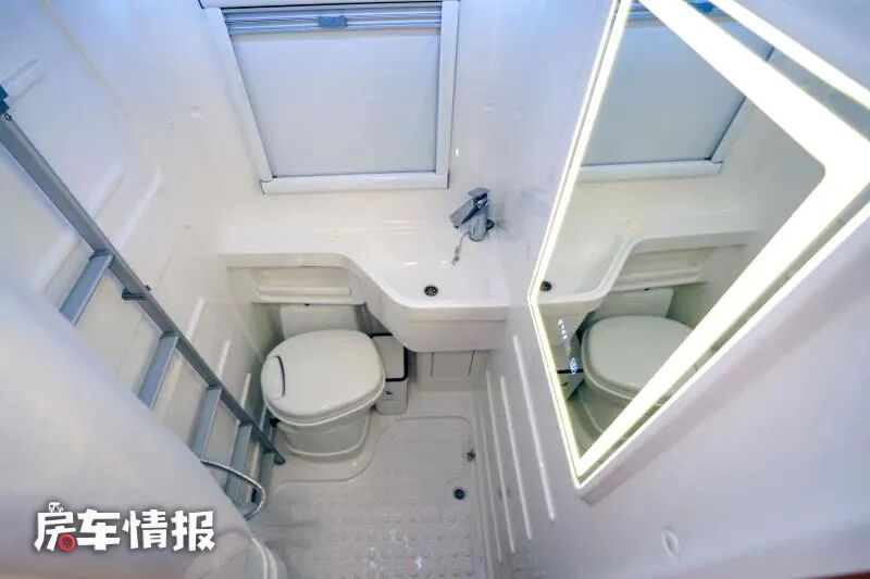 与之相对的是全车的卫浴室,内部配置了马桶、一体式的洗手台盆、淋浴花洒、带LED灯的梳妆镜等,日常的洗漱需求还是可以完美解决的。