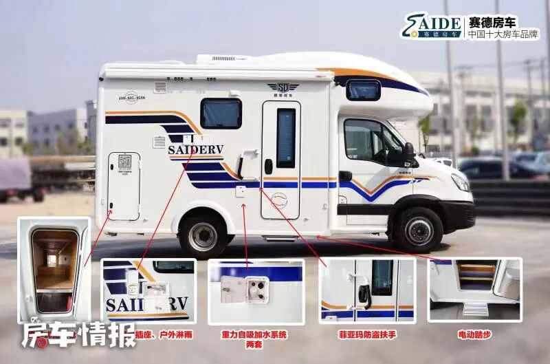 全车依然是保留了白鲸的经典造型,圆滑的大额头看起来饱满又灵动,车身配色也使用了赛德一贯的经典配色,同时外部还配置了比较基础的设施,包括右侧上方的遮阳棚、下方的户外淋浴花洒,以及尾部的超大尺寸的贯通式储物舱,足以满足日常的需求。
