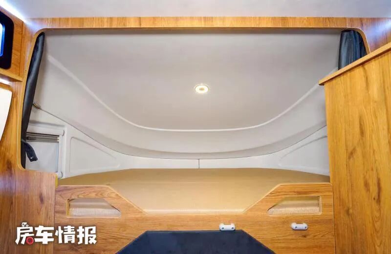 驾驶室上方的额头区域内标配一张双人额头床,平时可以容纳两个人使用,同时两侧还带有外推窗,可以保证整个空间的采光度。翻起床板还可以看到下方嵌入的液晶电视,也能为整个旅居生活提供娱乐需求。