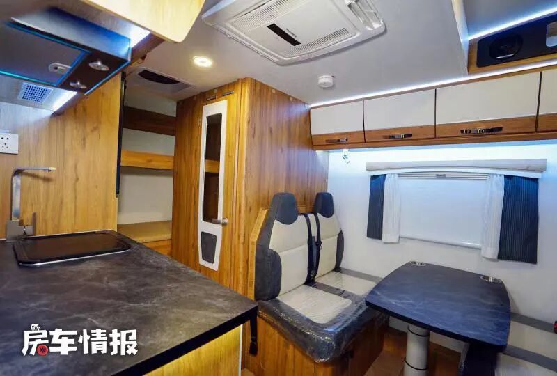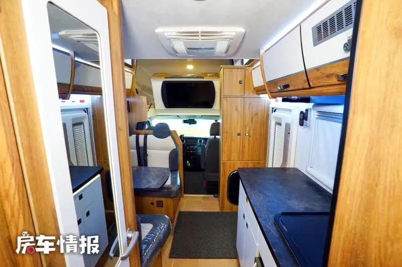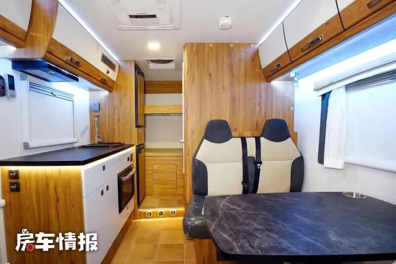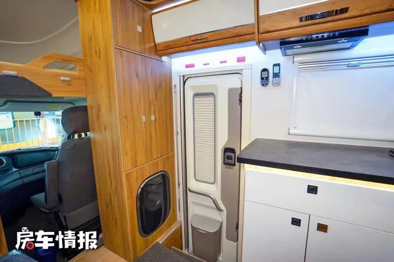 而副驾驶室后方一改往日的设计,设立了一组储物柜,既可以作为衣柜使用也能够充当鞋柜,另外下方还嵌入了一台mini洗衣机,为日后的旅居生活提供了便利。
