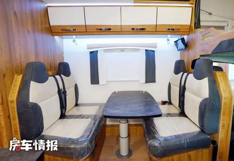 在前方会客区内采用了经典的四人对卡座+升降餐桌的设计,顶部还提供了四个储物吊柜,满足日常储物的需求,另外在前排座椅的上方还带有四路监控,可以及时的观察车辆周围的情况。