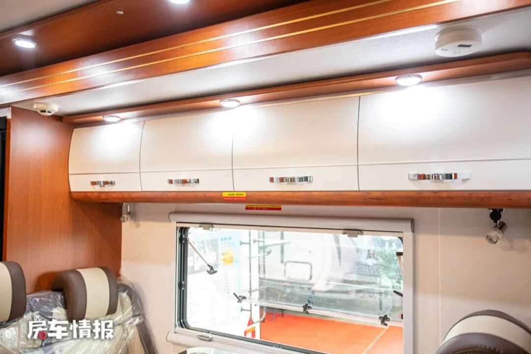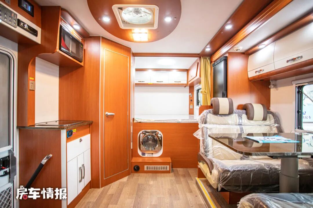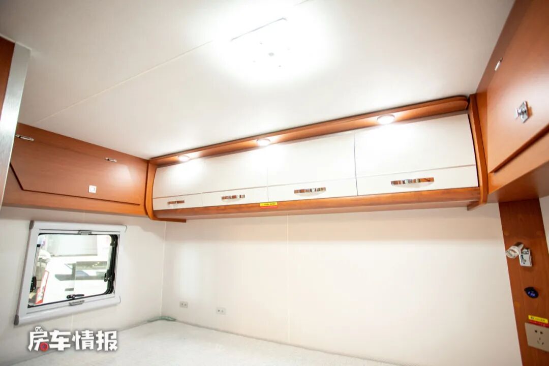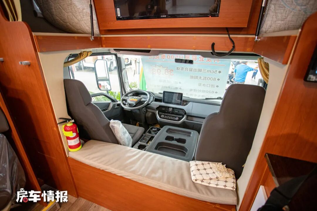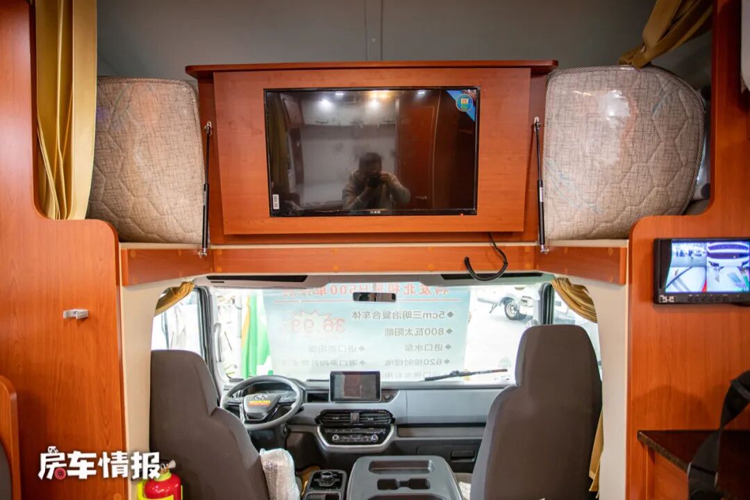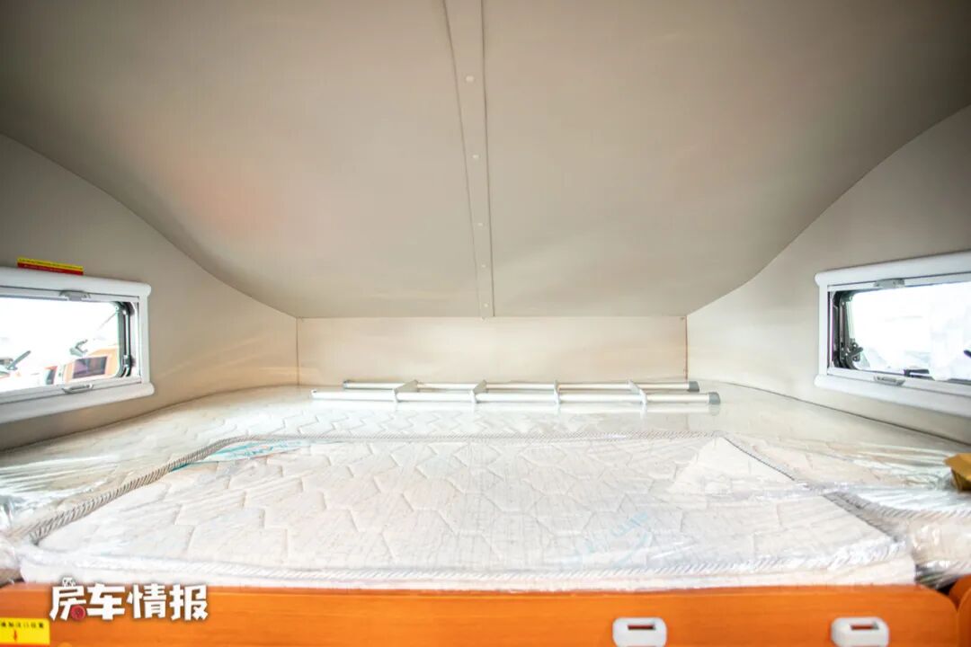 除去尾床和沙发床之外,在前侧的驾驶室上方还带有一张额头双人床,也能够满足两个人睡觉休息使用。床板上翻后,可以看见下方32寸的智能电视,平时可以坐在会客区看电视追剧。