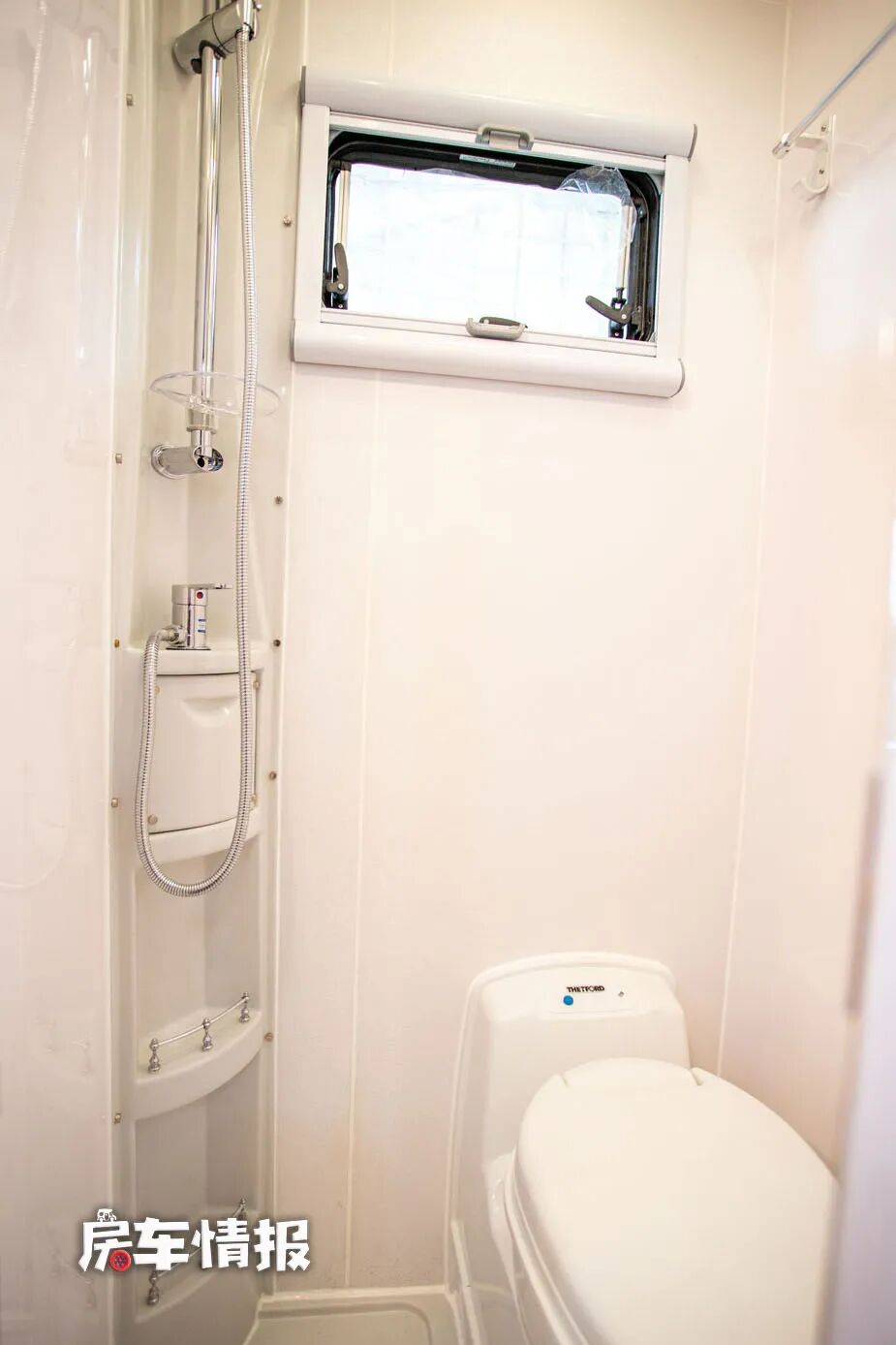 厨房区后方是一间独立的卫浴室,内部的配置也比较齐全,提供了水龙头、淋浴花洒、毛巾架和马桶,能够满足出行最基本的洗漱需求。