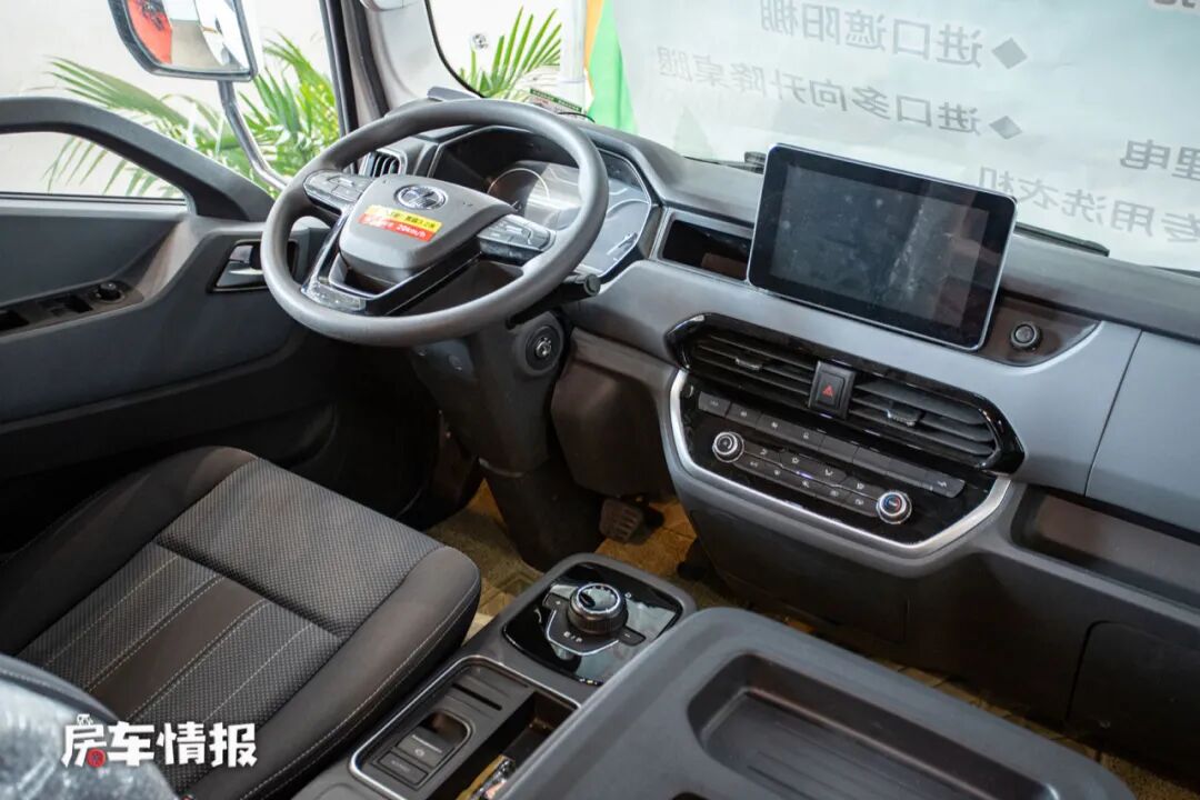 驾驶室的内部也较为宽敞,搭配全黑色内饰颜色,看起来非常的低调和商务,不仅配备了中控彩色显示大屏,还提供多功能方向盘,在两个驾驶室座椅中间还提供了一个大尺寸的扶手箱,平时可以将随身物品存放在这里。