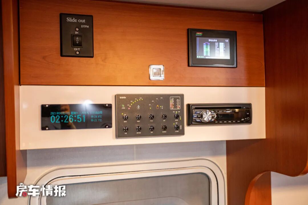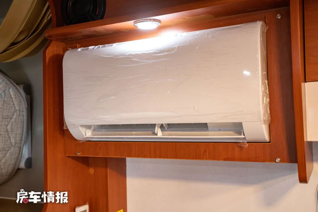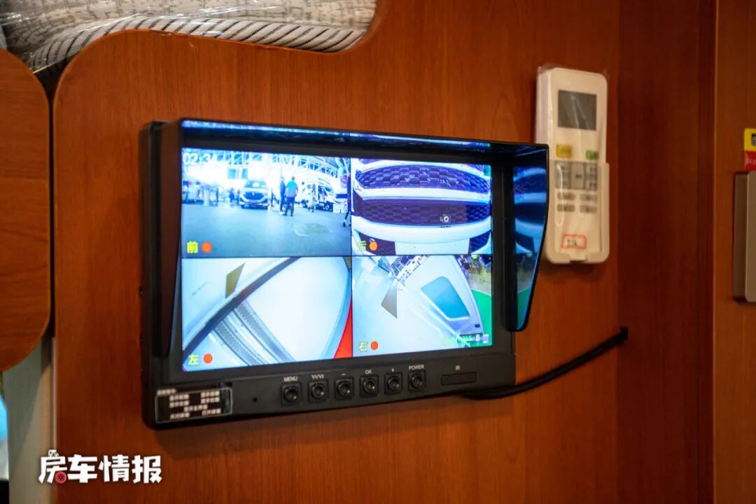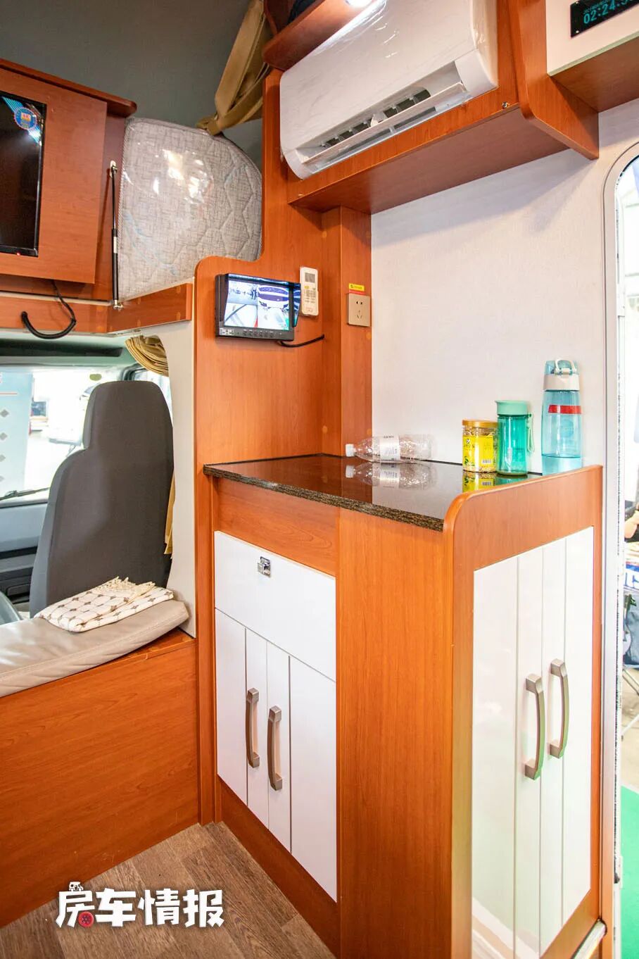 乘客门的前侧提供了一个储物柜,侧面带有鞋柜,正面带有储物空间,上面空置的台面平时也可以外接一台电磁炉或其他家用小电器,旁边的壁板是全车的四路监控显示器,便于平日观察整车的情况。在上方还镶嵌了一台家用变频空调,随时调节车内温度,整体来说这个区域的配置还是比较人性化的设计的。